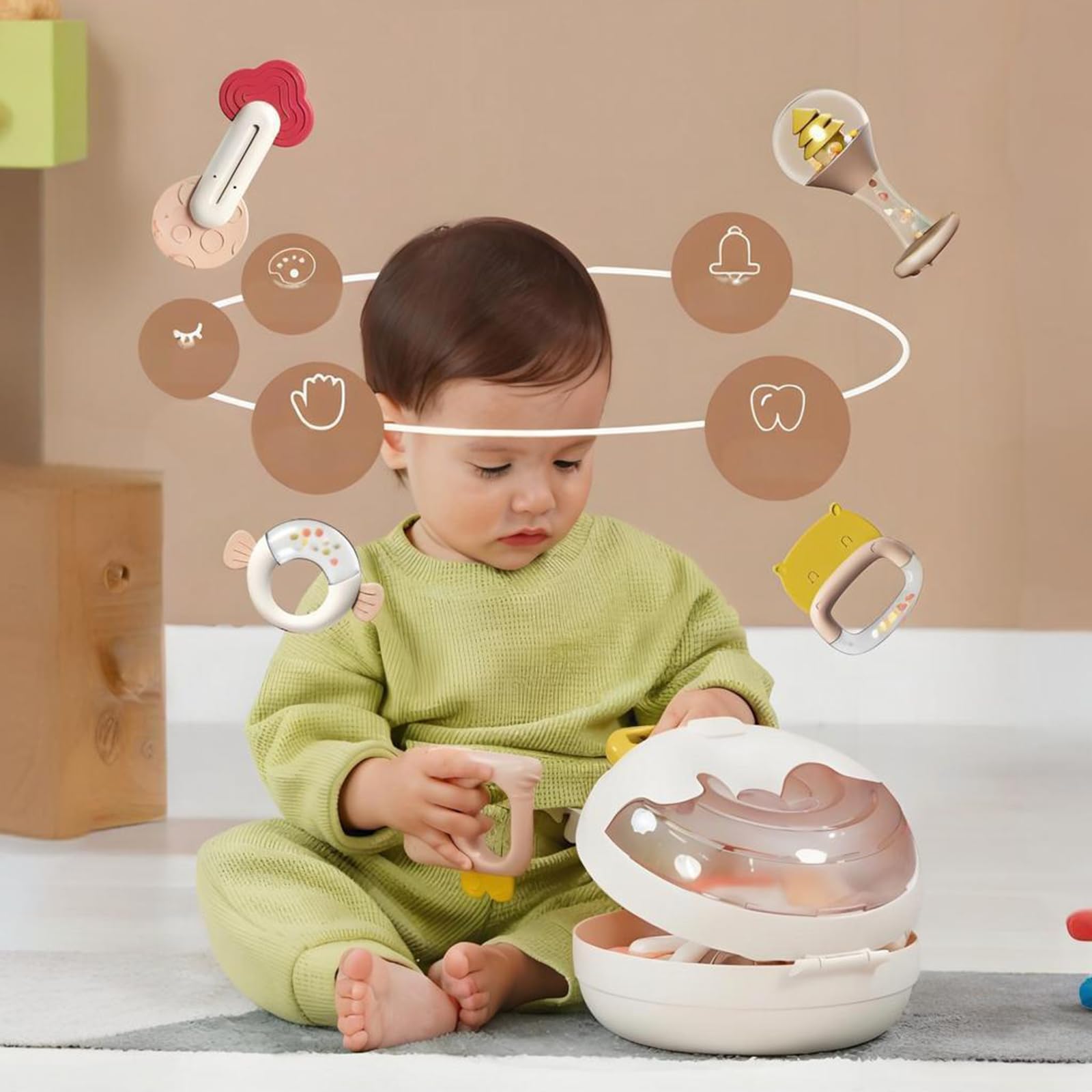 - Baby Sensory Toy: This rattle toy set is specifically designed for babies during critical stages of sensory development, containing different styles of rattle teether toys in a cute storage box. Suitable for babies 3-6 months old.