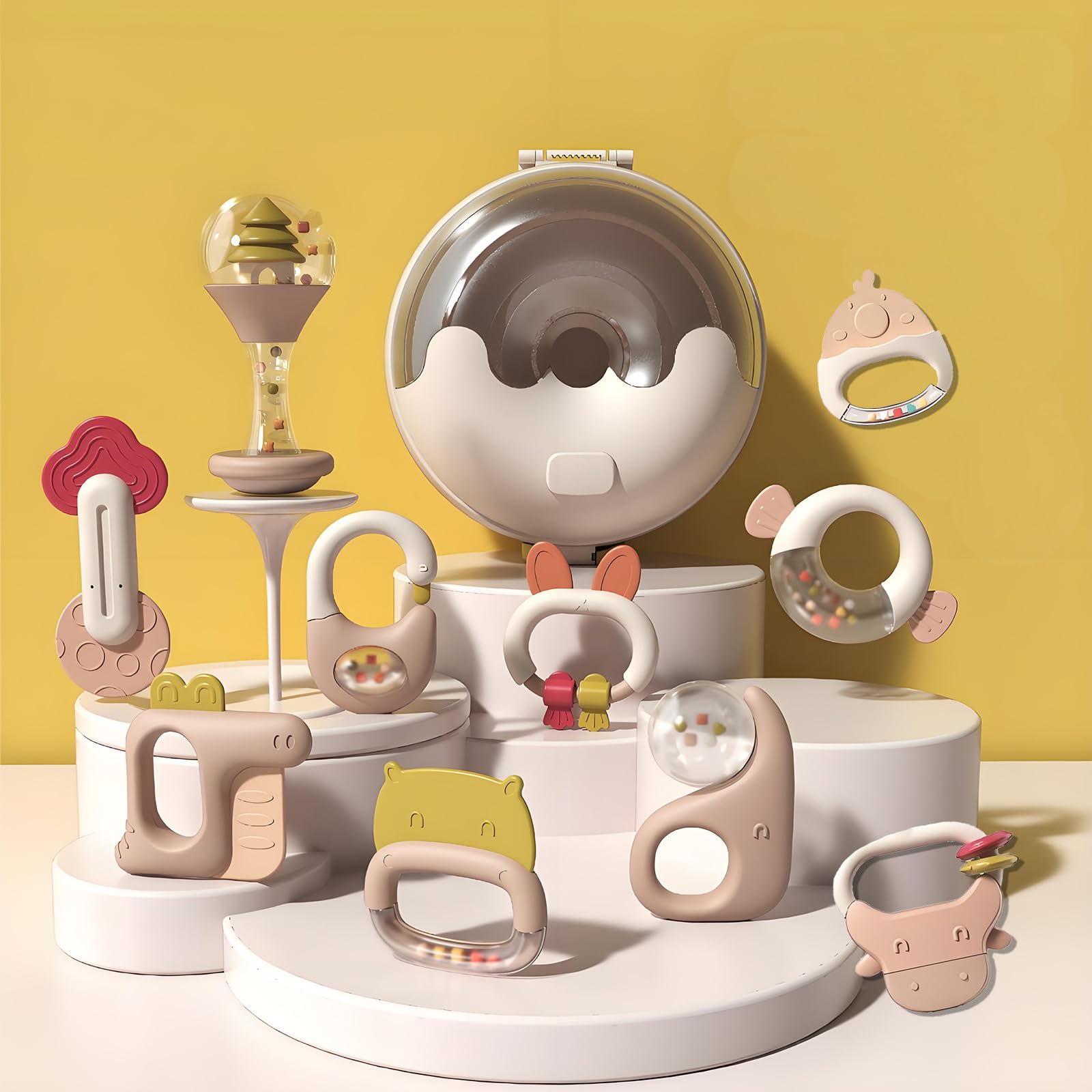 0-6 Months Baby Rattle Teether Toy Set,Infant Silicone Teether Chew Toys,Sensory Toy Set for Babies,Gift for Newborn Baby (10pcs-Set)