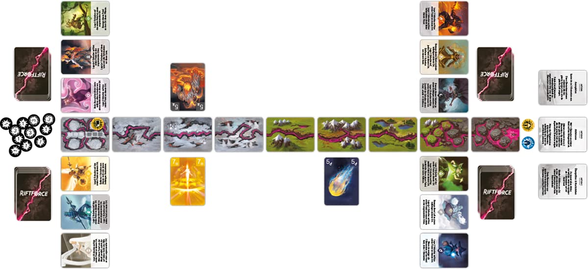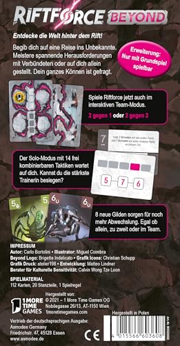Product description: As you examine the Rift more closely, you will discover a passage to the world behind it. Embark on a journey into the unknown and meet new allies. Riftforce-Beyond is an expansion for the two-player card game Riftforce. It not only brings eight new guilds and a solo mode, but also offers you the opportunity to play alone, in three or fours. In team mode, either one player competes against a team of two players or two teams deliver a thrilling double, two against two. In solo mode, you play against the trainer, whose difficulty level you can determine yourself. You can freely combine 14 tactics. The eight new guilds, including beast, love and music, provide even more variety. Discover the world behind the Rift! Box contents: 1 game instructions 8 guilds each with 1 summoner and 9 elementals, 3 locations, 2 sequences, 7 challenges, 5 control plans, 15 attack plans, 20 damage tiles