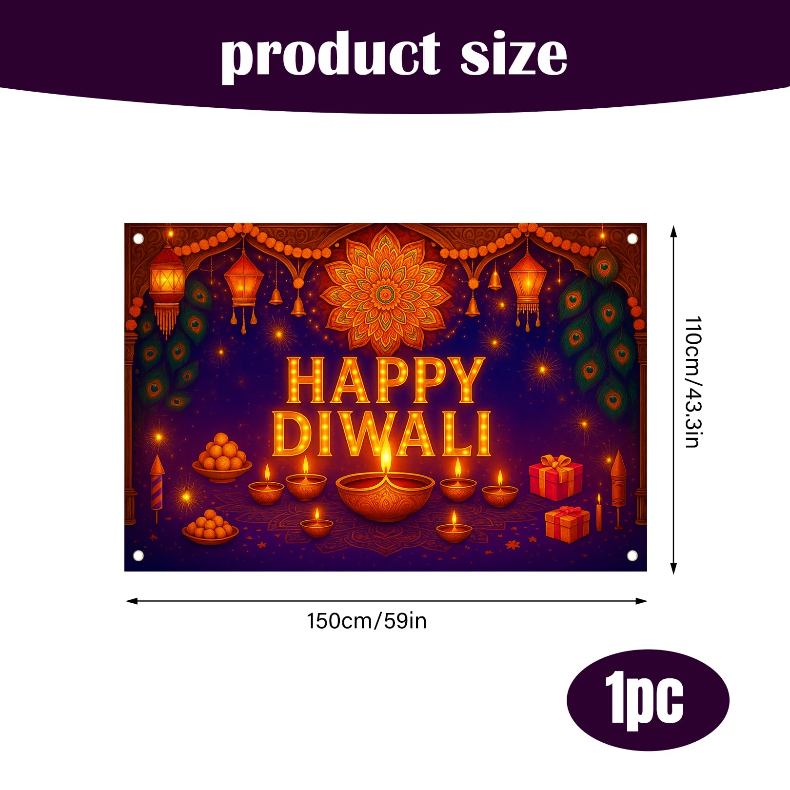 1 Pcs Happy Diwali Banner Decorations, Diwali Decorations for House Home Wall Hanging, Large Fabric Background for Deepavali Festival of Lights, Indoor Outdoor House Decor, 150 * 110CM with 10M rope