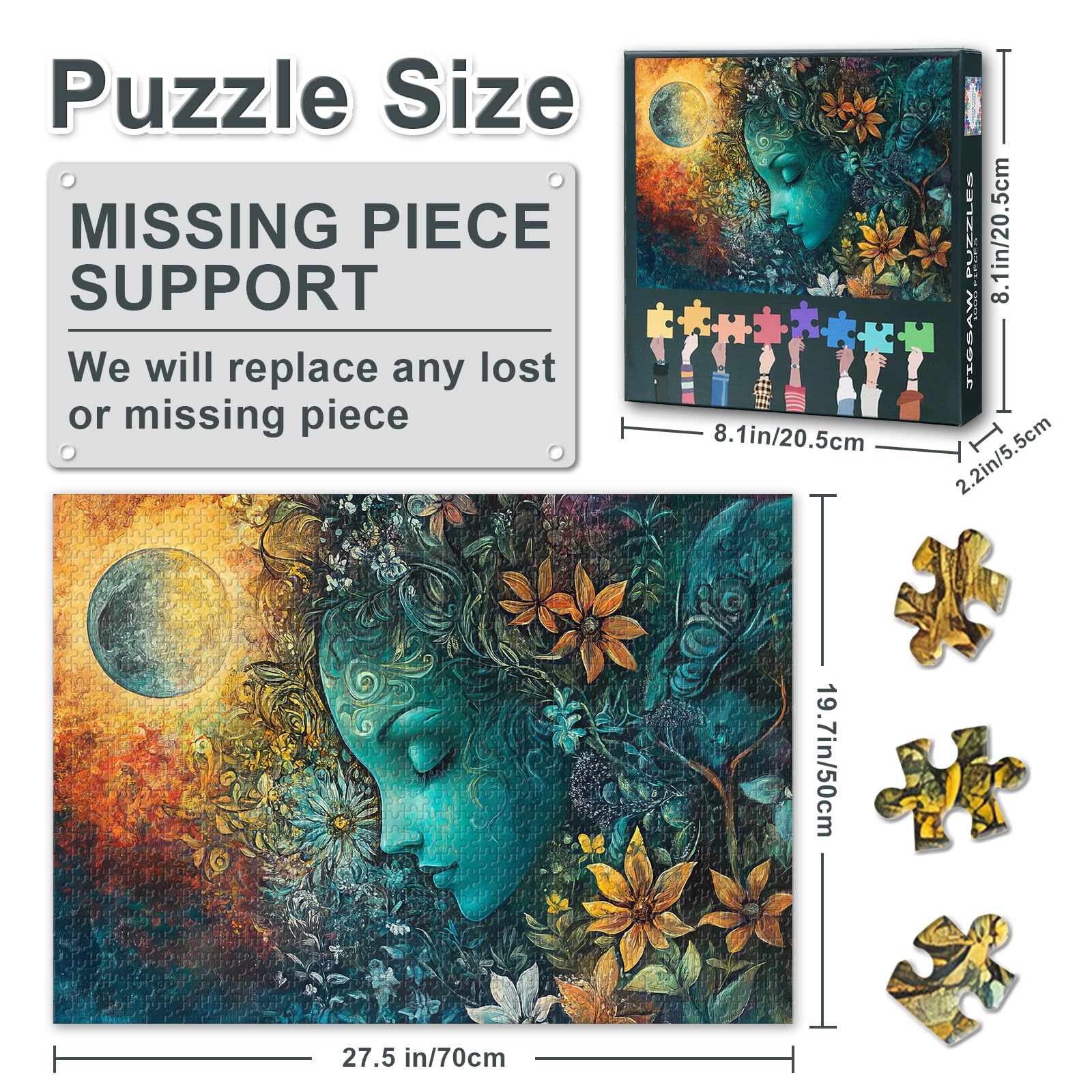 - Jigsaw Puzzles 1000 PiecesFinished product size 20 in * 27.5 in(50 *70 CM). Jigsaw Puzzle comes with a full-color reference poster to provide a reference for your assembly.