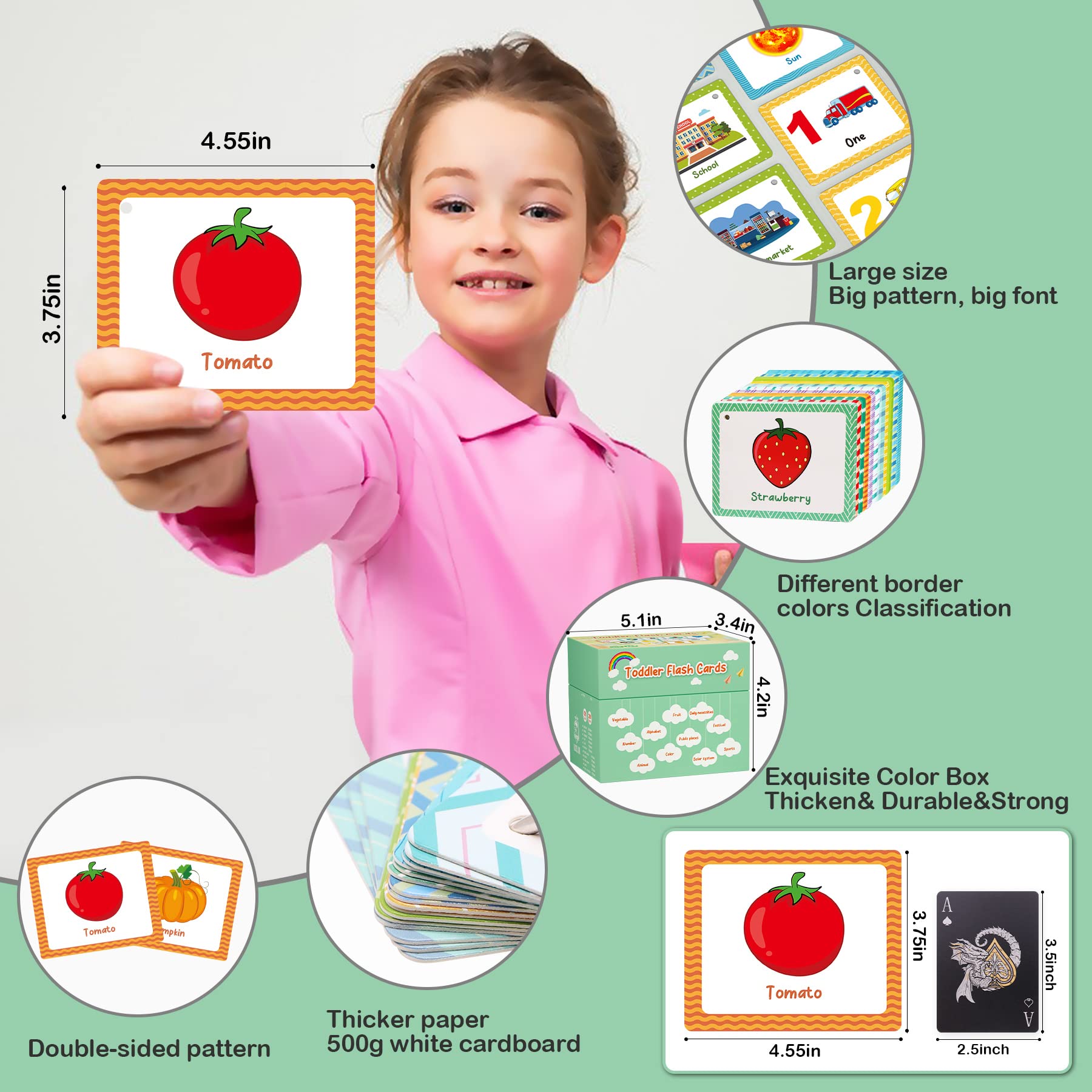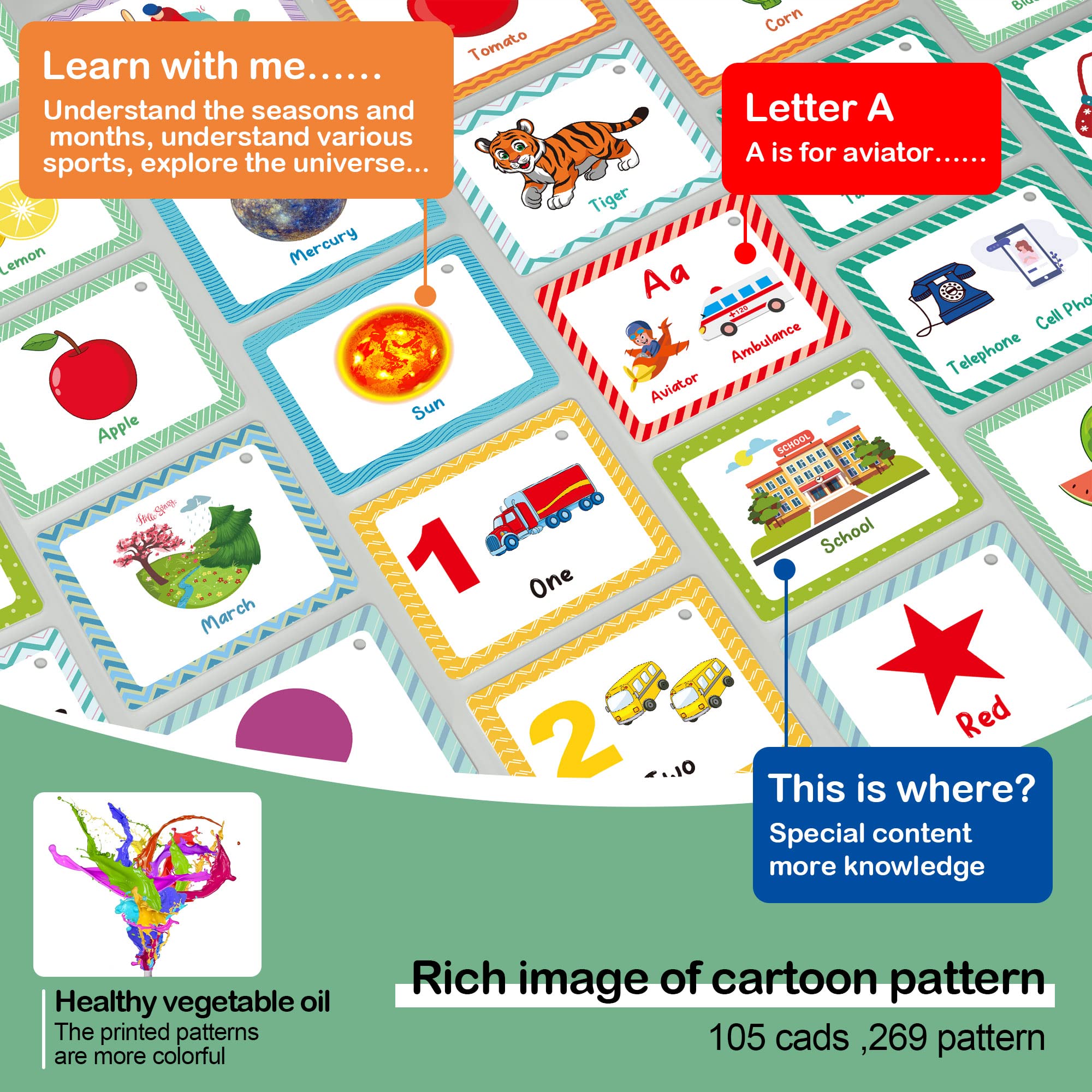 - 1500g thicken paper. Waterproof surface durabletear resistant. 4.55×3.75 inch perfect toddlers hand size. 5.1×4.2×3.4 inch beautiful exquisite gift box. Including 105pcs cards, 269 pictures. 4pcs metal sorting rings. Animals Number ABC Alphabet Fruits Vegetables Shapes Transportation Preschool Kindergarten ABC Alphabet toddler flash cards for Toddlers 2-4 years ages.