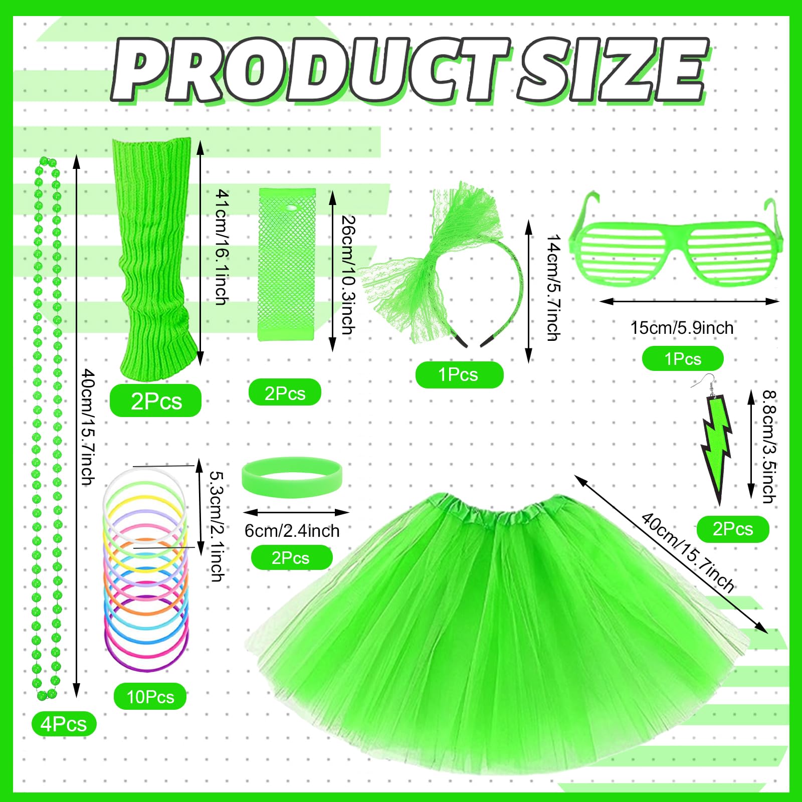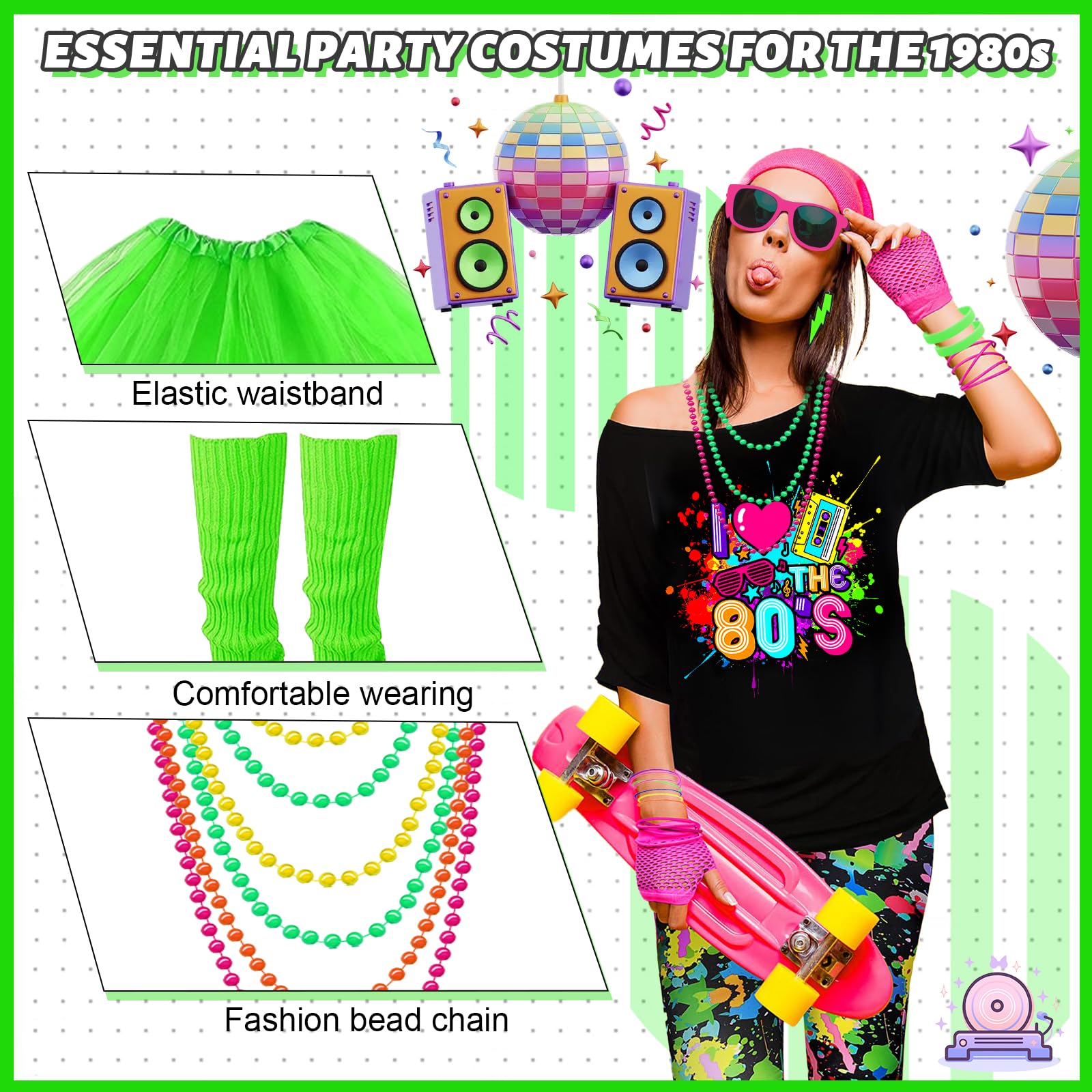 ???? Each accessory in this set is designed to complement one another, making it easy to mix and match for the perfect 80s-inspired outfit. Pair the tutu skirt with the t-shirt for a classic look or layer the neon leg warmers and bracelets for an extra dose of fun. The versatile accessories give you endless styling options, whether you want to go all out or add a touch of retro to your everyday wardrobe.