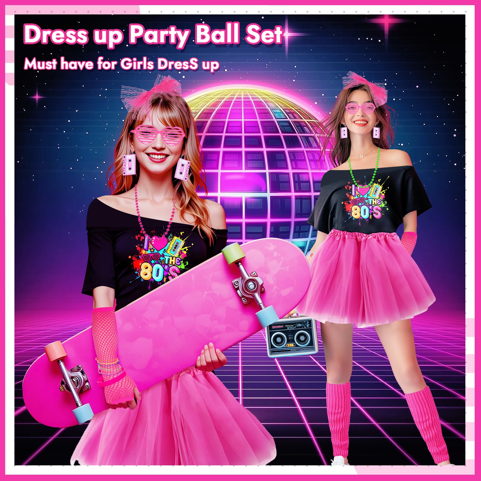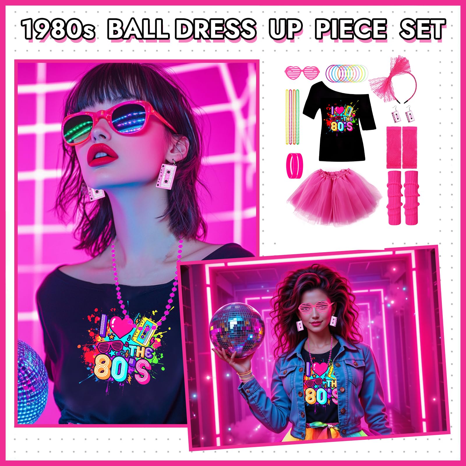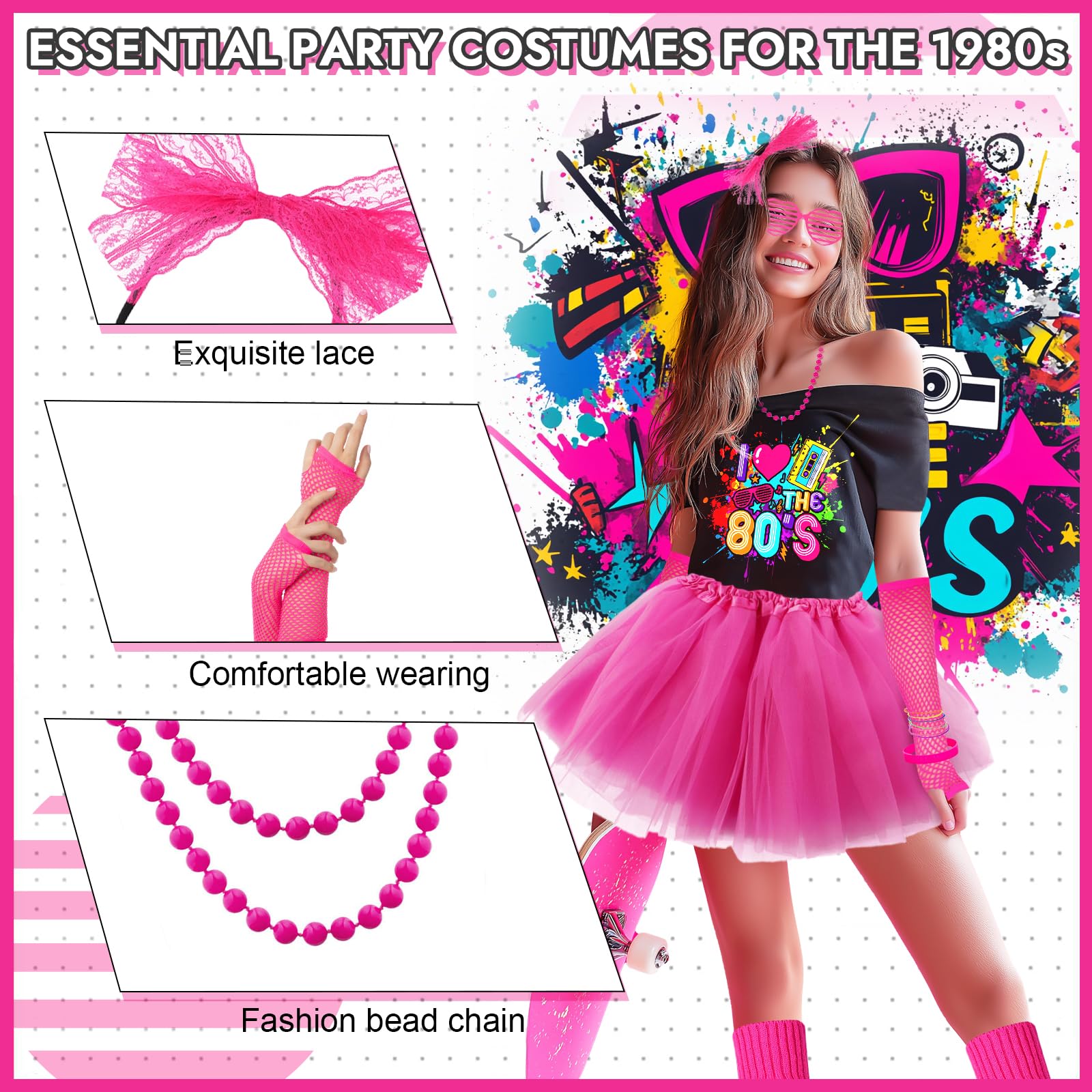 • 1980s Retro Party Set Transform into an 80s superstar with this all-inclusive 80s costume accessories set! The pink 80s accessories pack includes a “I Love the 80s” off-shoulder t-shirt, a vibrant pink tutu skirt, fishnet gloves, a lace headband, neon rainbow bracelets, silicone wide bracelet, star string earrings, pink hollow glassess, colorful bead necklaces, and a pair of pink leg warmers. With these bold and colorful accessories, youll have everything you need to capture the iconic 80s look in one convenient bundle!