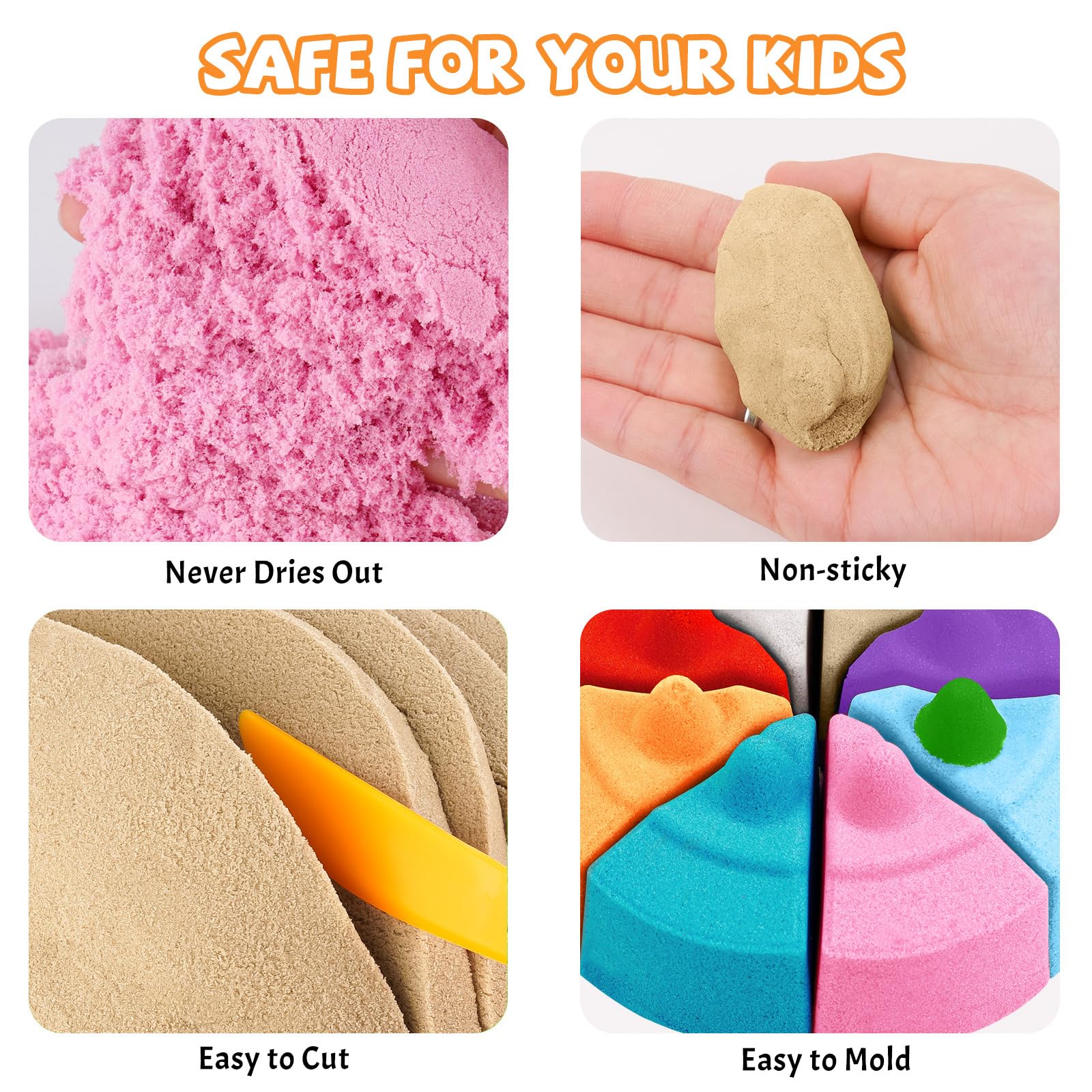 - Safe & Non-ToxicOur play sand is made from 100% eco-friendly, non-toxic materials, fully complying with U.S. toy safety standards, making it completely safe for play. Comprising 98% pure sand and 2% polymer, it sticks together easily and never dries out. The sand adheres only to itself, not sticking to hands or clothes.