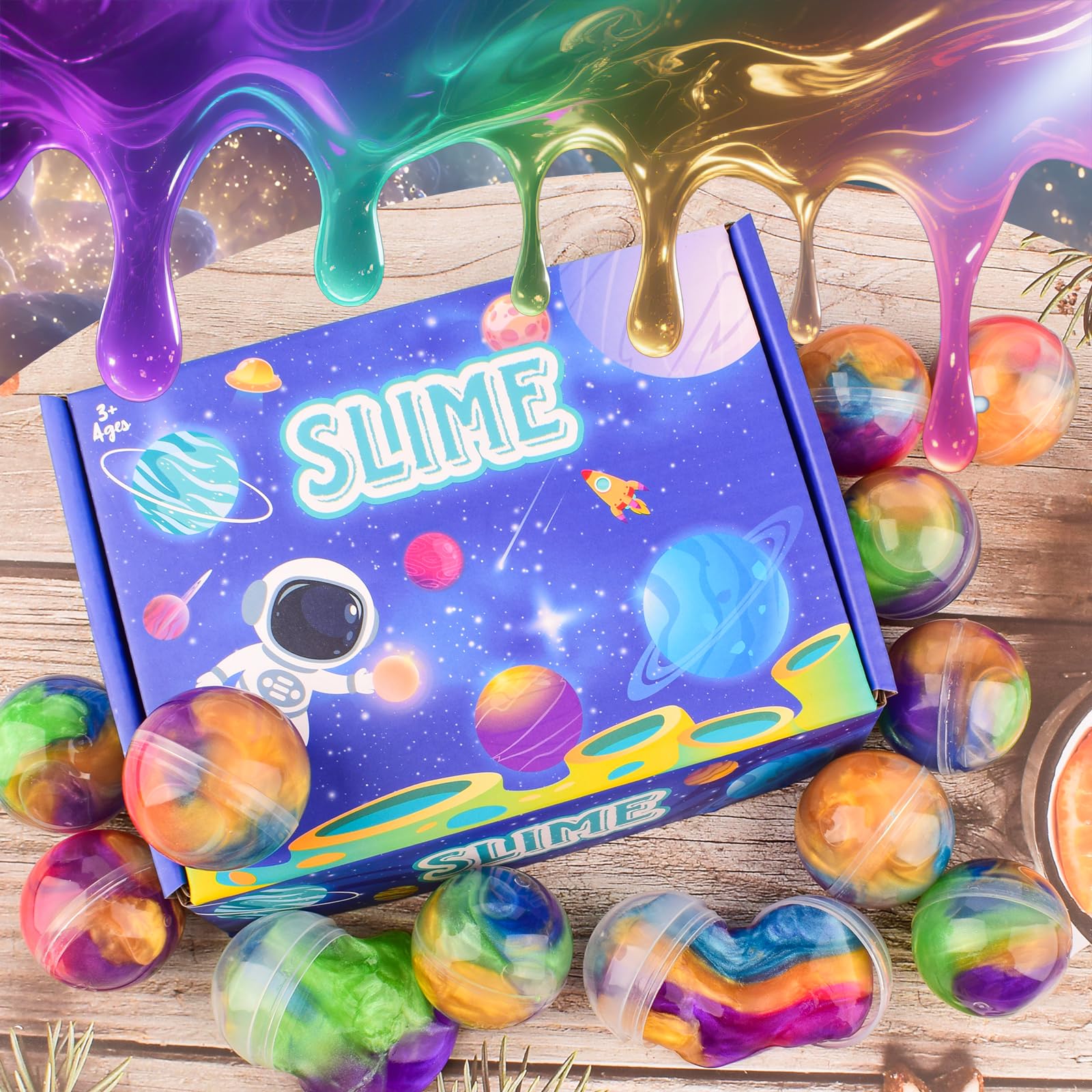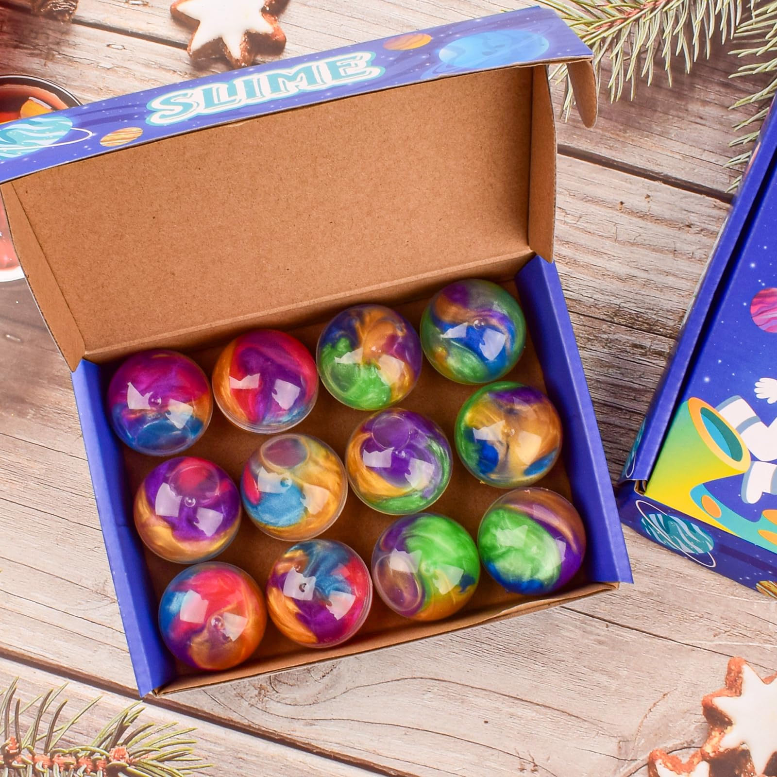 Unleash a burst of color and creativity with this 12 Pack Galaxy Slime Balls! Each slime ball comes in a 3.8cm clear container filled with vibrant rainbow galaxy slime. Kids will love the dazzling mix of colors and the smooth, stretchy texture that makes every squeeze and stretch a joyful experience. Our upgraded non-sticky formula ensures hands stay clean and surfaces mess-free, making it a worry-free toy for parents. Compact and portable, these slime balls are perfect for sharing, gifting, or keeping kids entertained at home and on the go. Whether you’re looking for birthday party favors, classroom rewards, holiday gifts, or stress-relief toys, Galaxy Slime Balls are the perfect choice. Safe, fun, and endlessly entertaining, they spark imagination and deliver hours of play for kids and stress relief for adults alike. Bring the magic of the galaxy to playtime – colorful, and fun for everyone!” “slime balls galaxy slime rainbow putty non sticky toys kids party favors mini slime stress relief soft stretchy classroom rewards birthday gift treasure box toy bulk pack