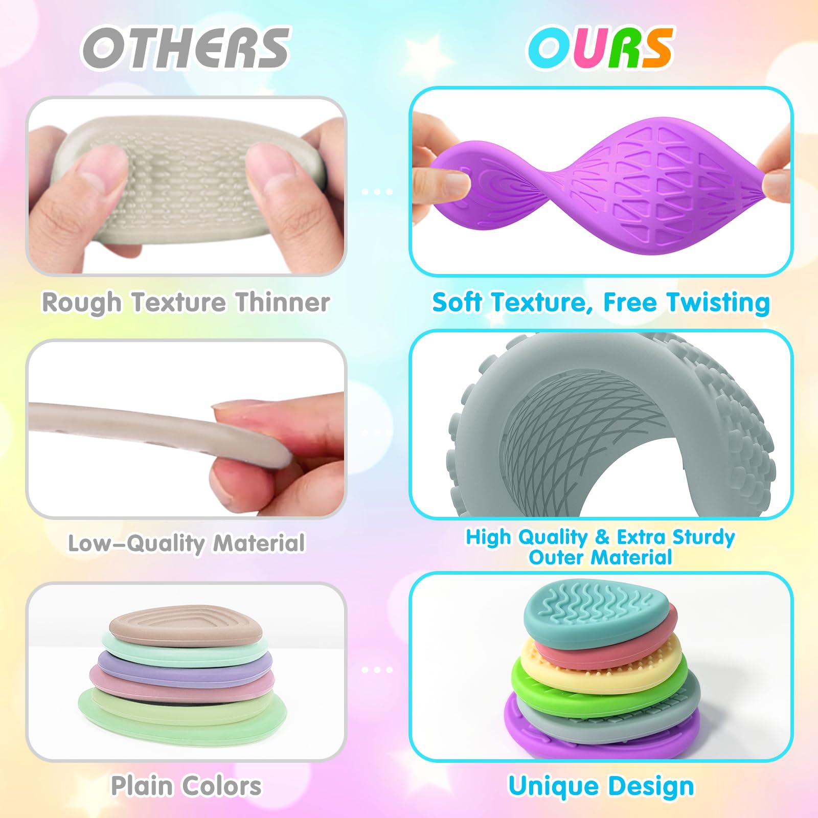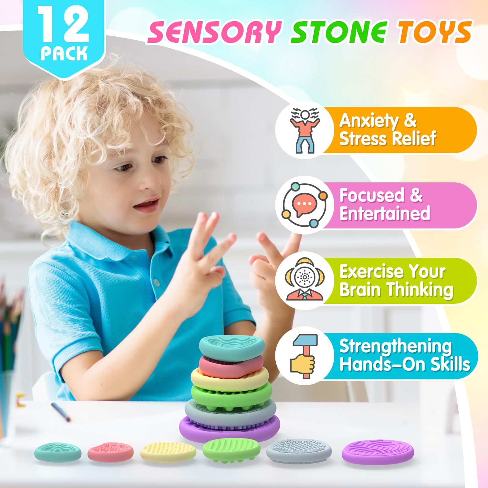 - Multiple Colorful:Our sensory toy set contains 6 sensory stones in different colours and interesting texture patterns, 2 of each for a total of 12 packs. Hard, soft, stimulating, smooth, you’ll always find something to satisfy your senses. Each stone fits perfectly in your hand so you can move smoothly between them with one hand