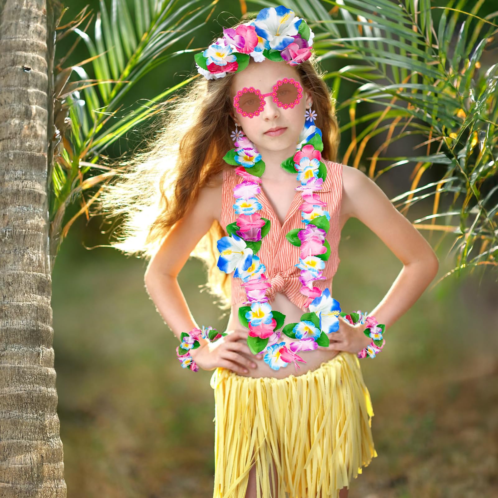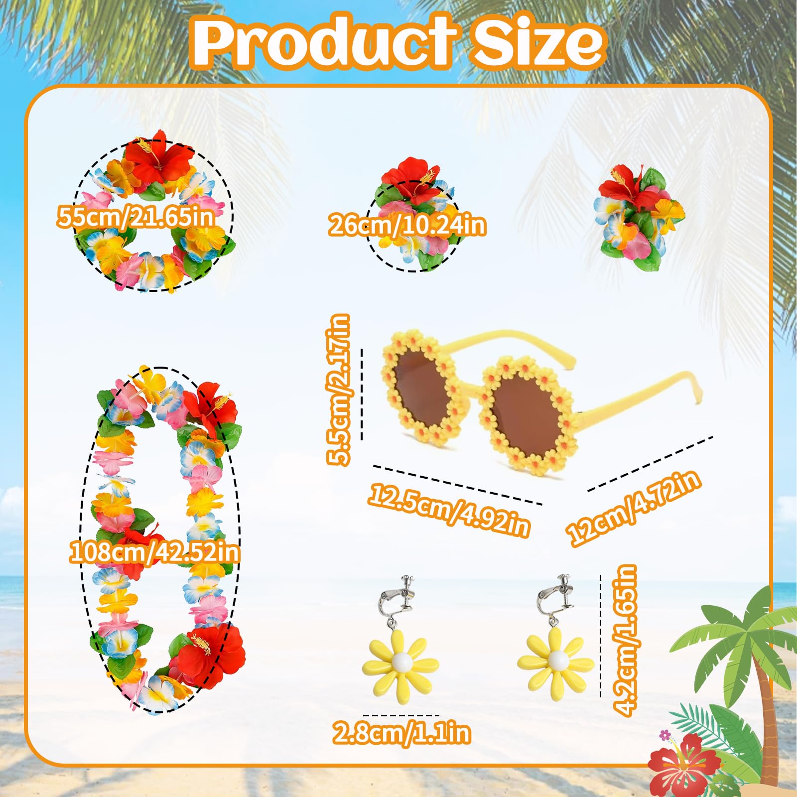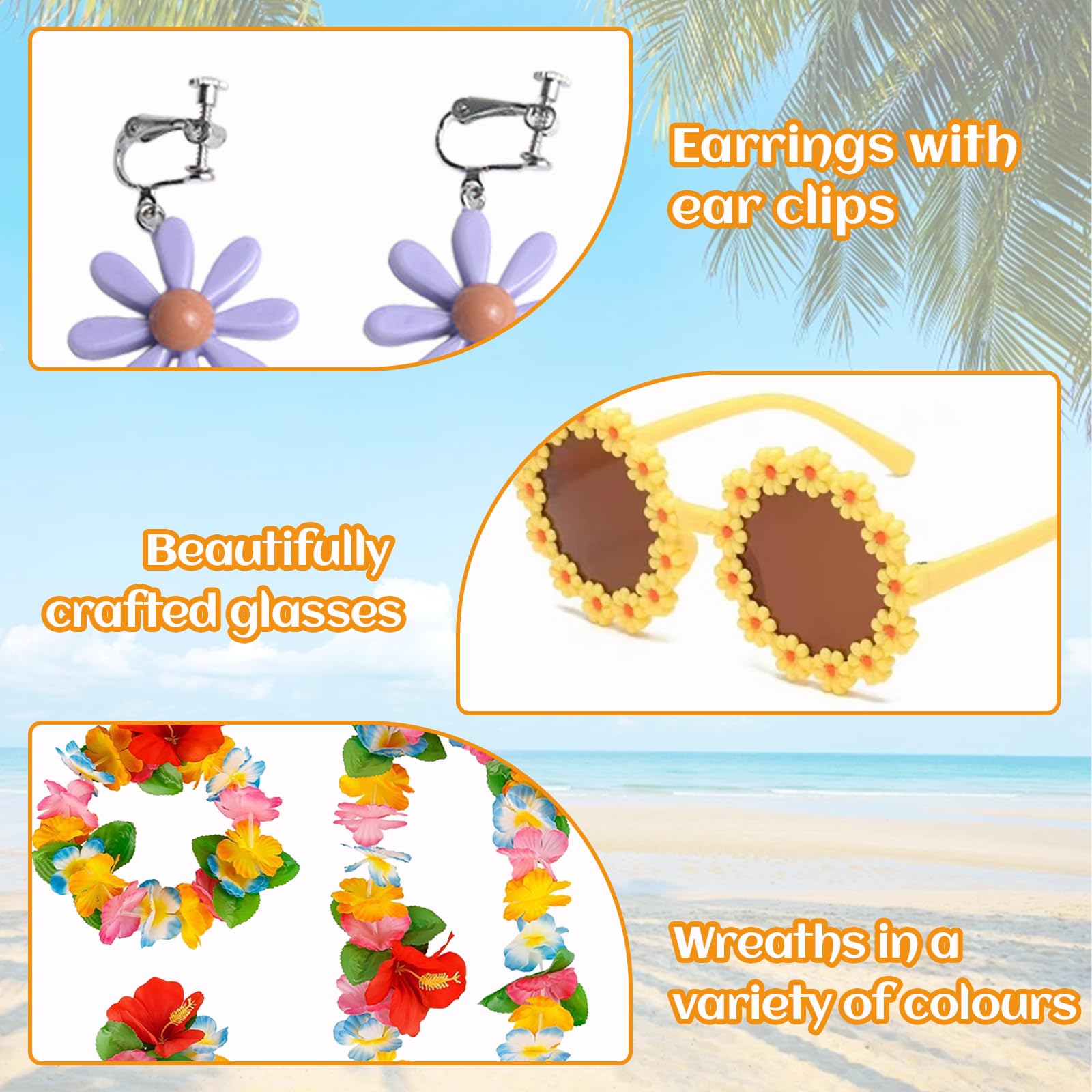 High quality material, comfortable and durable: The garland is made of brightly coloured imitation flowers, not easy to fade, with elastic rope design, freely adjustable elasticity, comfortable to wear. The earrings and glasses are made of smooth and safy PP material, which is safe and skin-friendly, especially suitable for children to wear, and can be used repeatedly and treasured for a long time after the party!