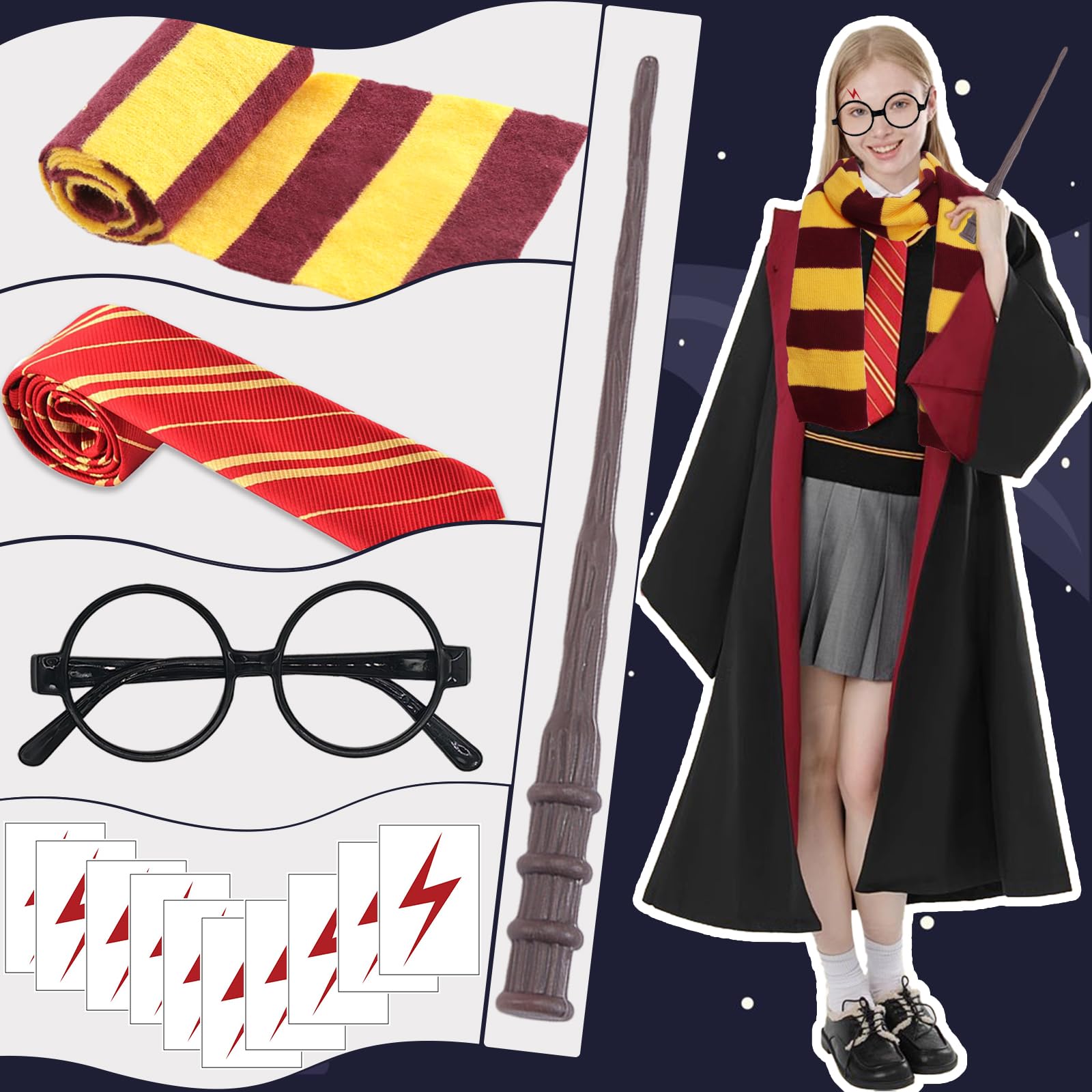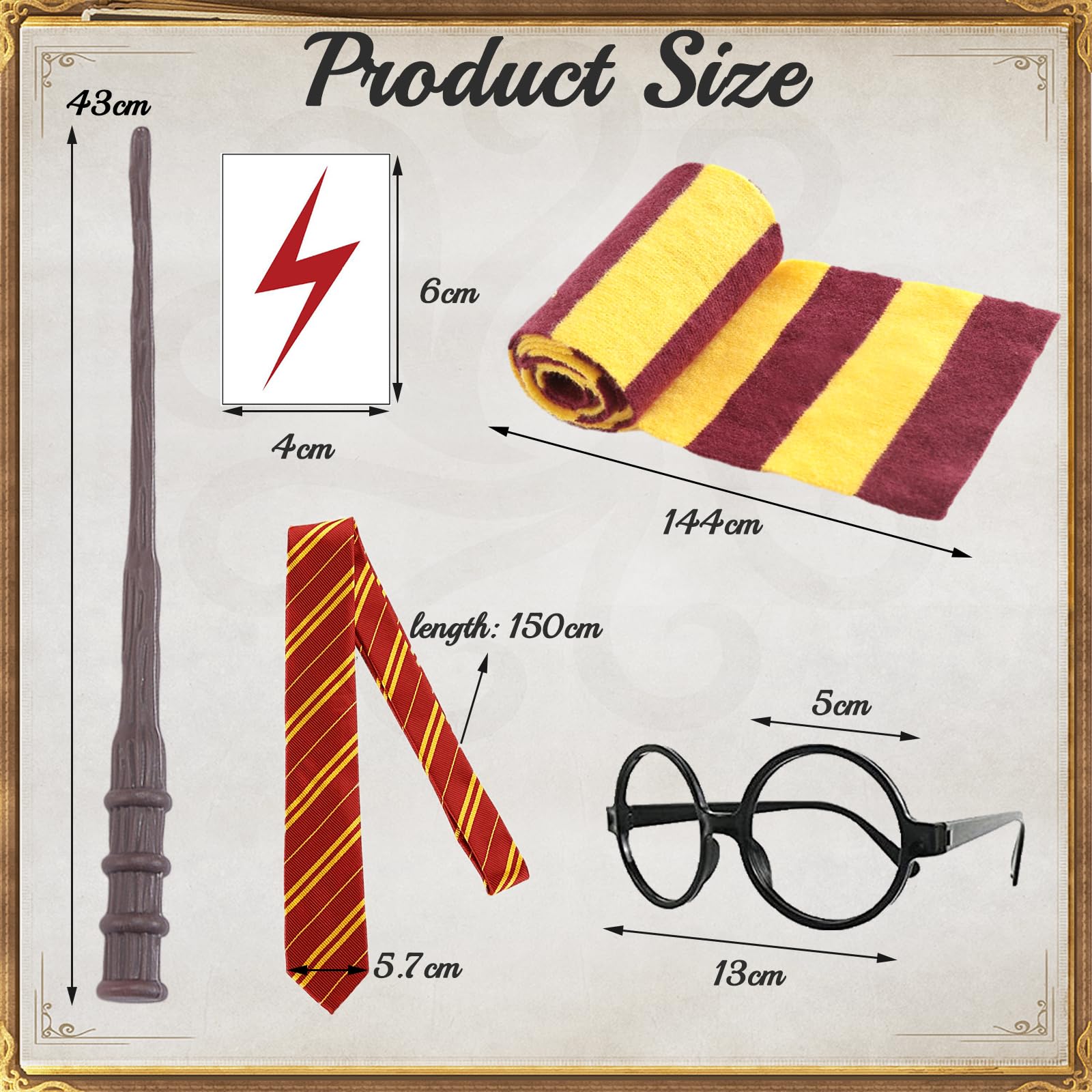 - Wizard Accessories SetOur wizard set includes 1 magic magic rod, 1 red and yellow stripe tie, 1 knitted scarf, 10 tattoo stickers, and 1 pair of round frames without lens glasses. Wearing our accessories and transformed into an excellent wizard.