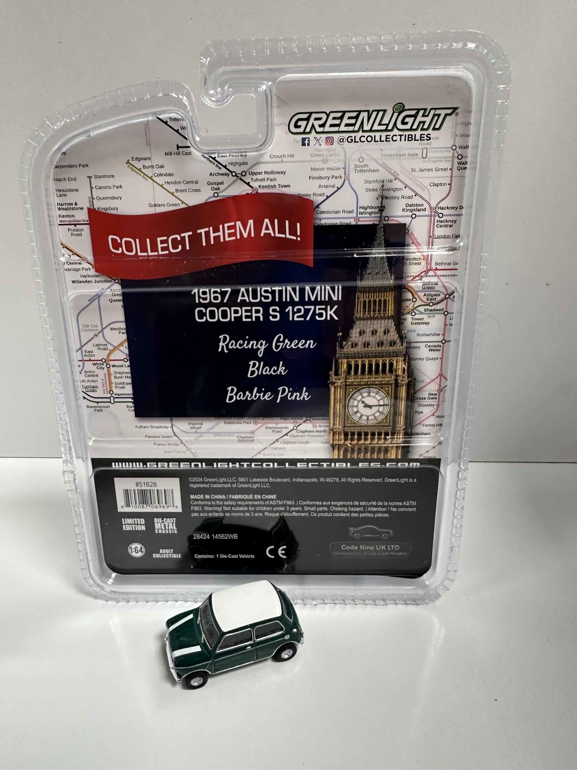 1/64 scale diecast model of 1967 Austin Mini Cooper S 1275K Racing Green with white roof and bonnet stripes