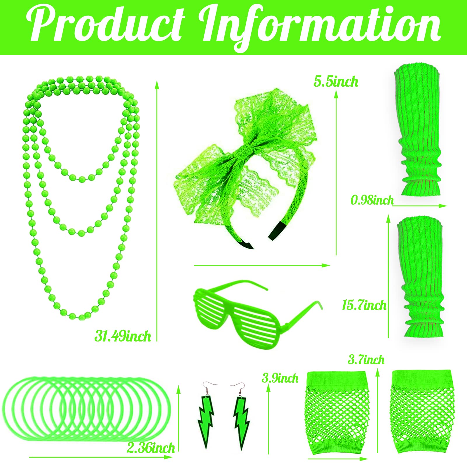 19Pcs Ladies 80s Accessories, Green 80s Fancy Dress for Women with Lightning Earrings Necklace Fishnet Gloves Headband for Retro Parties Hen Do Parties Girls Kids-Green