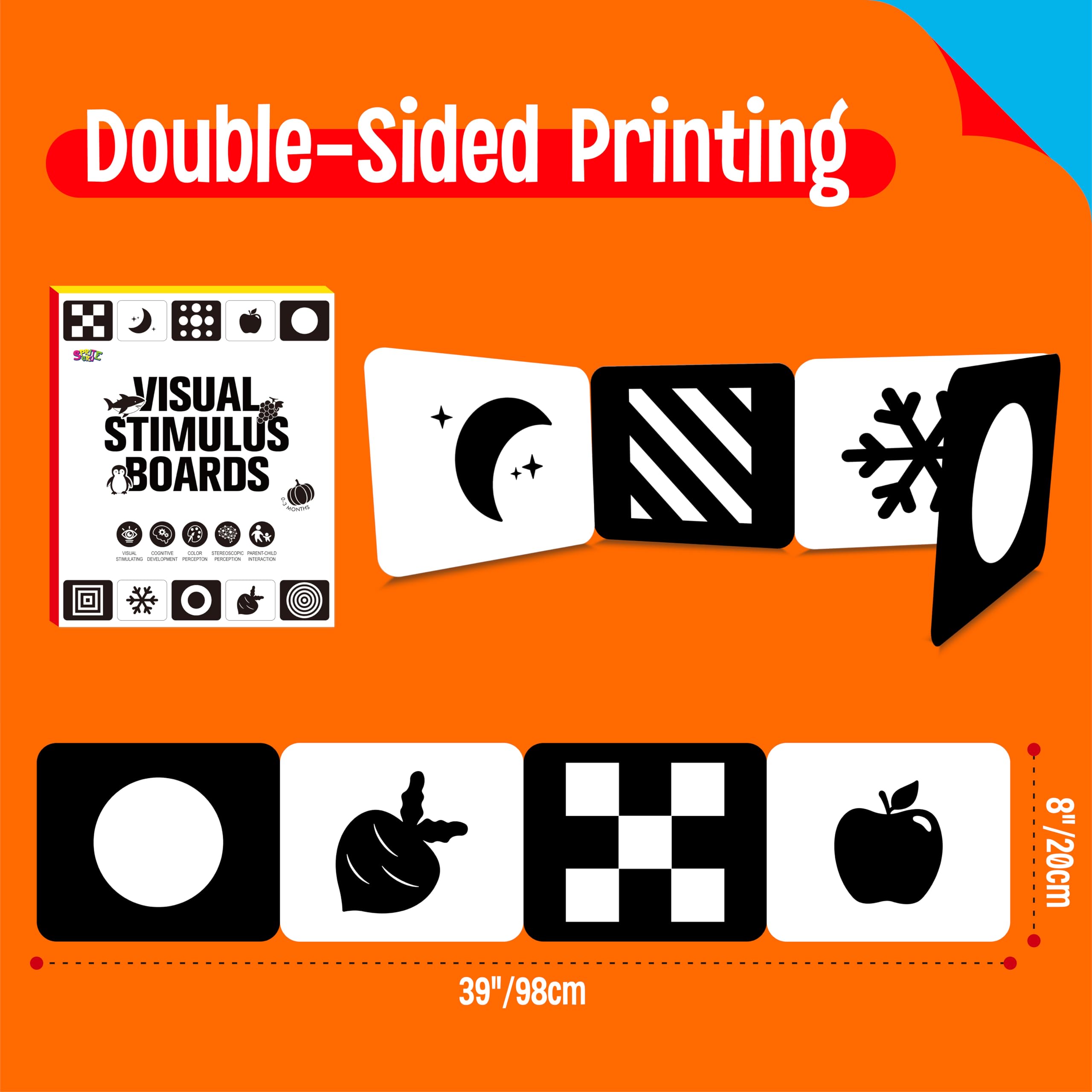 - Double-side Design: Both two sides are printed different images with black or white background. Specifically designed high-contrast black and white patterns help stimulate visual development in newborns and young infants by capturing their gaze and strengthening focus skills.