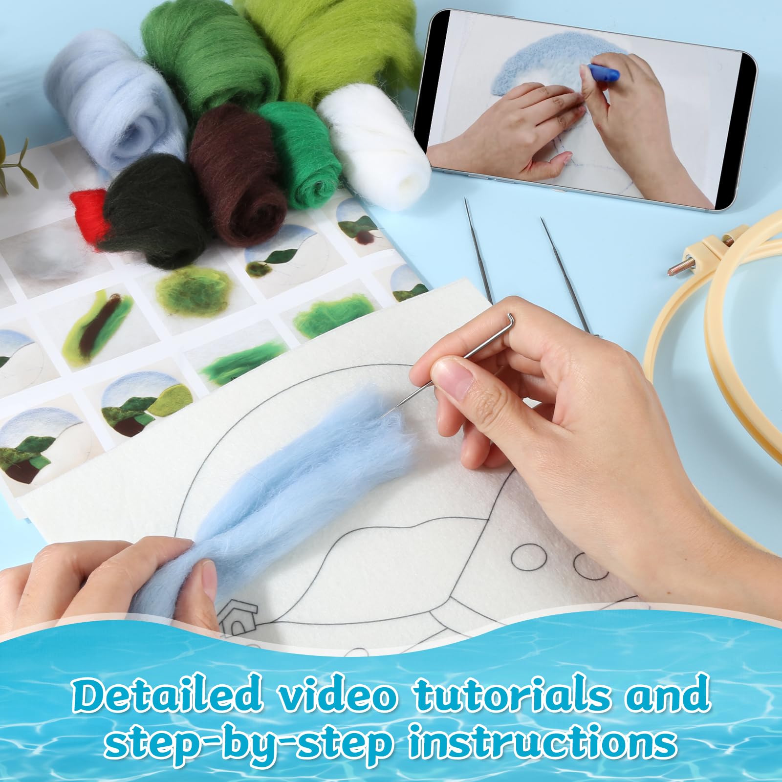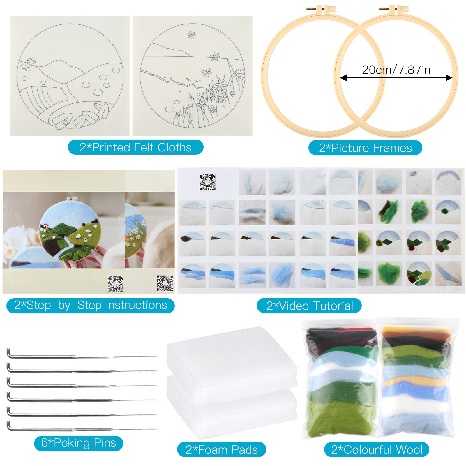 - Needle Felting Kit: Felting kits includes 2 x wool material packs, 2 x felt cloth with different patterns, 2 x embroidery hoops, 6 x needles, 2 x foam pads and 2 x instructions. The instructions also include HD video tutorials, so beginners can easily get started without stress