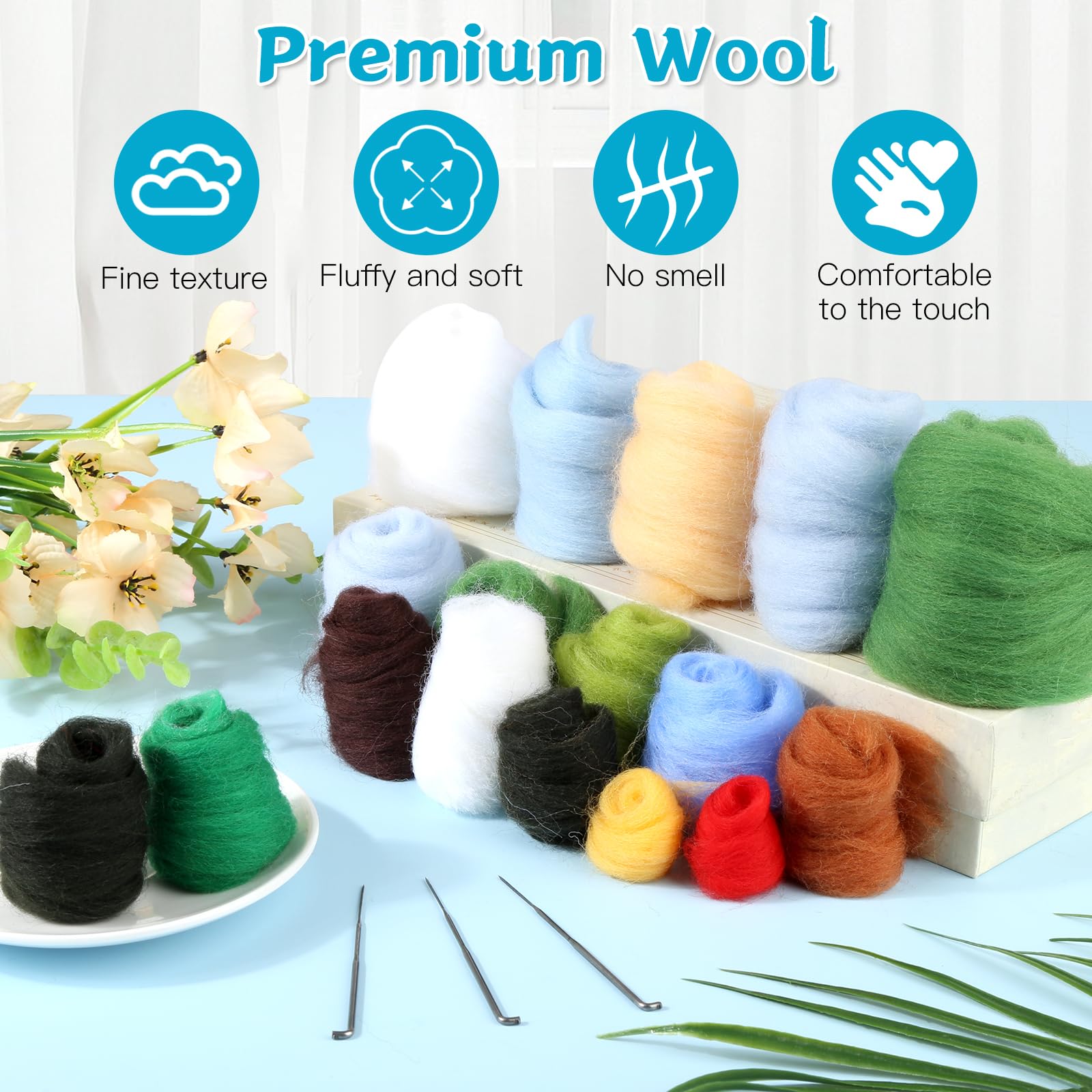 - Premium Wool: Our needle felting kits for adults is made of carefully selected wool, clean and tidy, fine texture, fluffy and soft, skin-friendly, odourless, safe to use, no knots, vibrant colours; foam pads protect your hands from injury