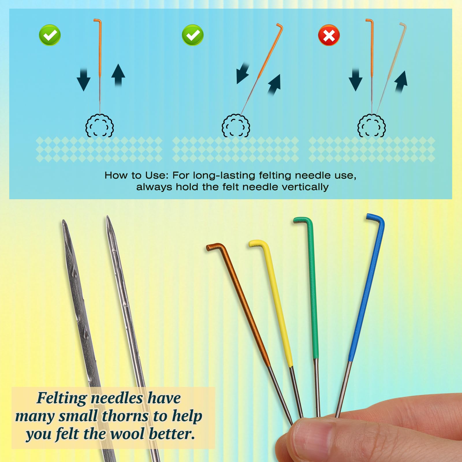 - [3 Sizes Triangular Needles]: This set of felting needles has 4 lengths, 9 cm/3.54 inches, 8.6 cm/3.4 inches, star needles 8cm/ 3.15 inches, and 7.9 cm/ 3.1 inches, enough for your basic need and replacement. The 36 Gauge (Blue) is used for coarse. The 38 Gauge (Green) is used for all fibers and on all styles of our wool felt. The 40 Gauge (Yellow) is used for detailing and sculpting.