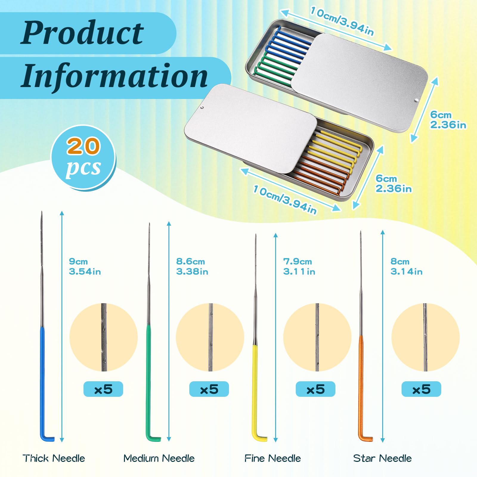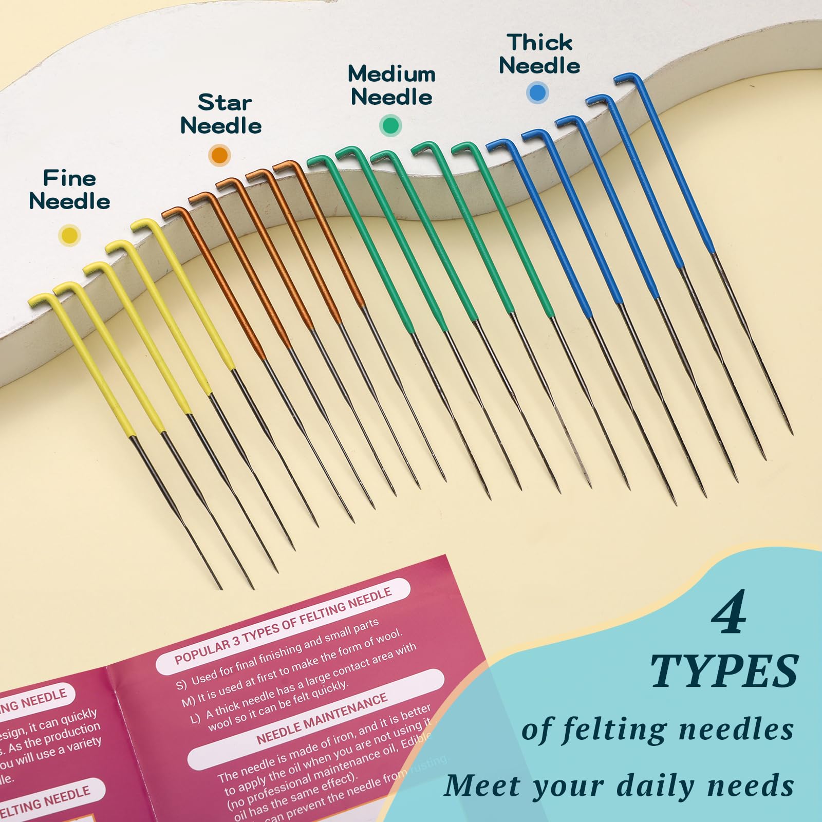 - [Needle Felting Kit]: 5 Pcs star needles, 15 pcs triangular needles, and a total of 20 pcs wool felt needles. Color-coded for easy identification. Come with 2* needle storage delicate square iron box. These high-quality needles are suitable for beginners learning the needle-felt craft while creating their first projects.