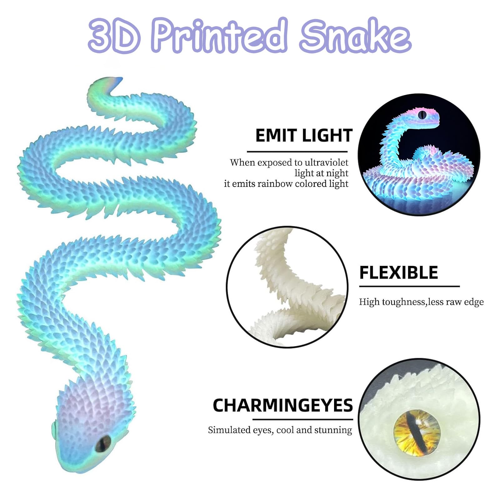 3d printed snake, fidget toy, glow in the dark animals, articular mobility, collectible home office decoration, 24in large size snake, educational gift toy, flexible joints figure, 3d animals fidget, luminous articular collectible