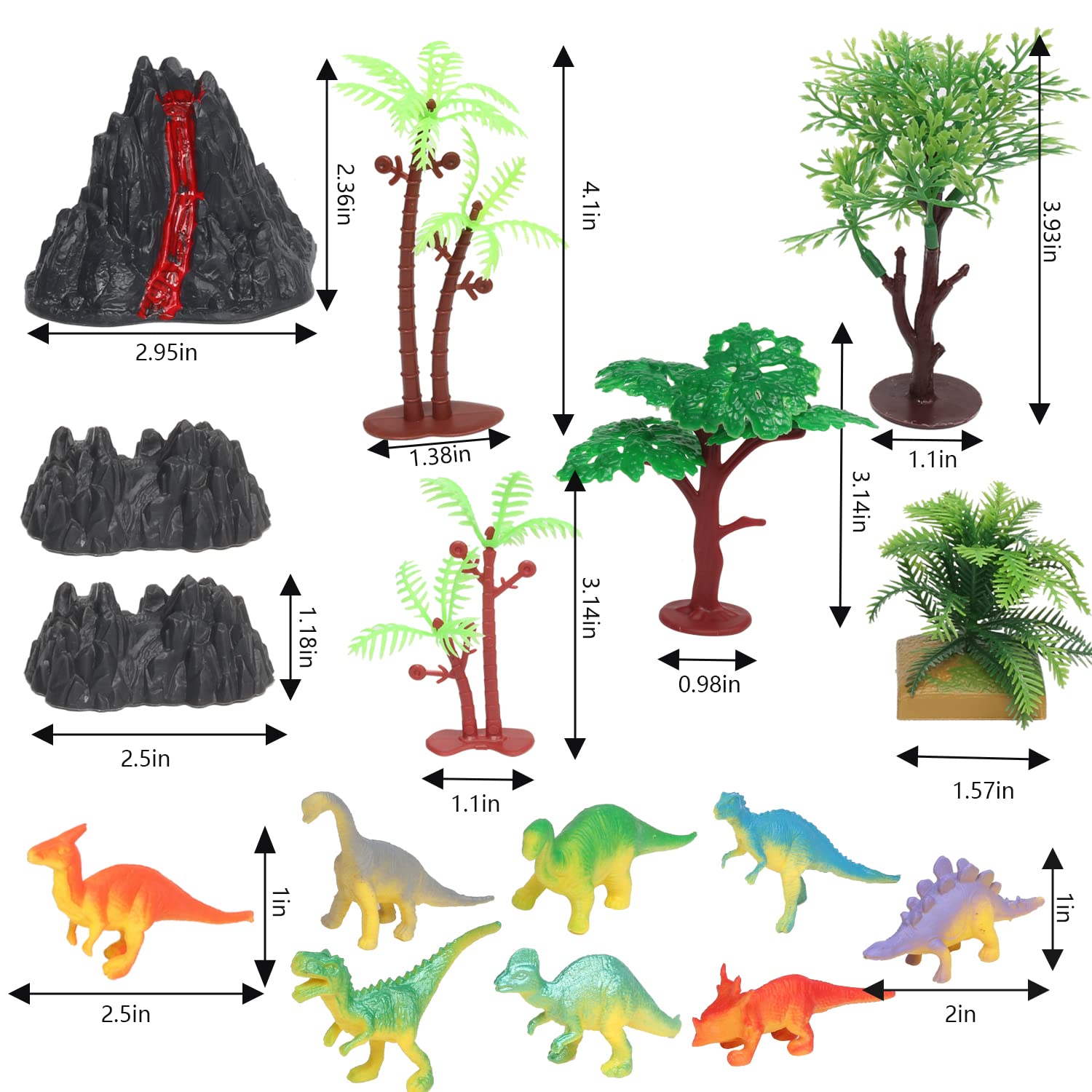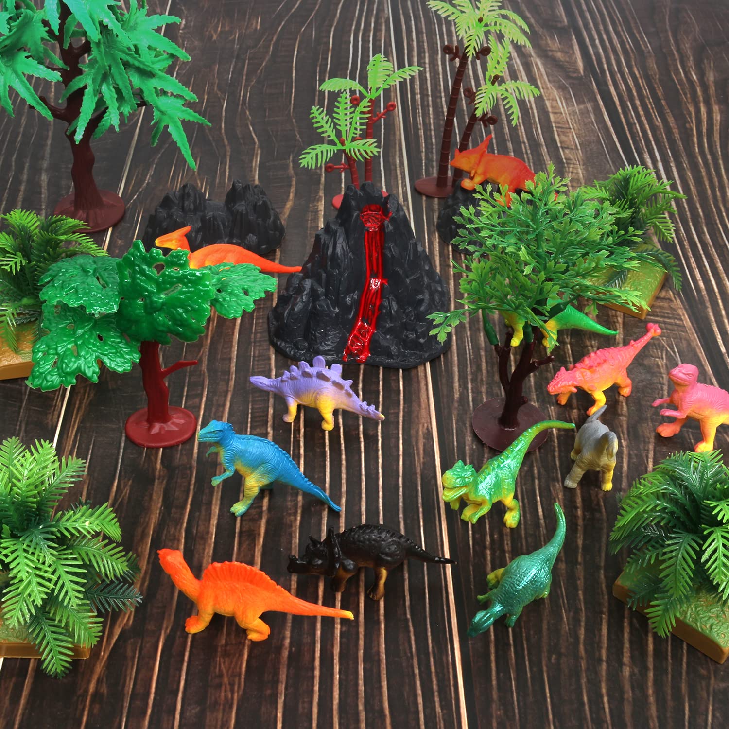 Package includeThe 25 Pcs dinosaur cake decorations set including 12pcs mini dinosaur figures, 10pcs trees models, 1pc volcano, 2pcs rock cake toy decors.