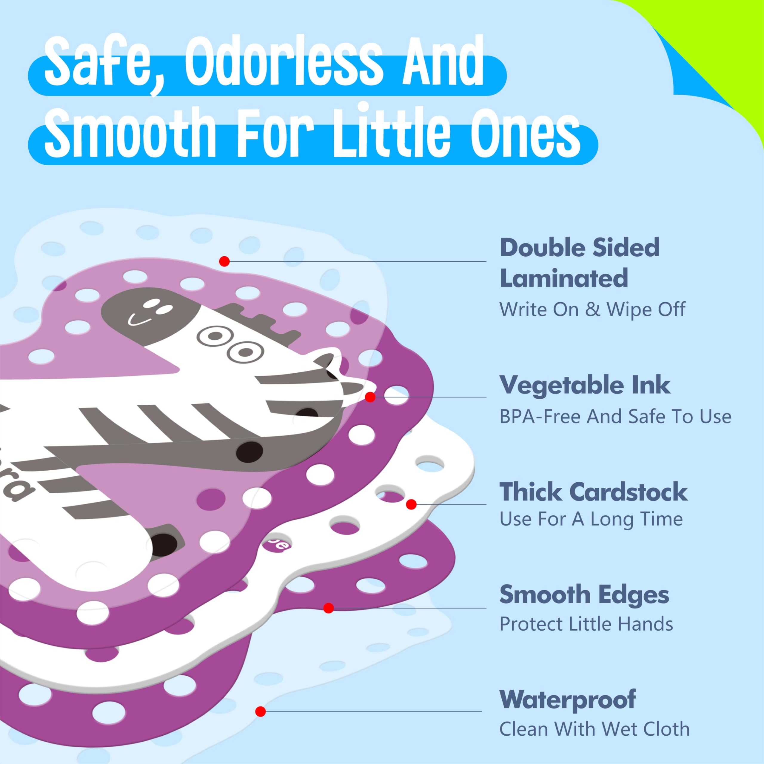 - High Quality and Durable: Our lacing cards are made of sturdy cardstock with premium material that ensures long service time and durability. All cards are printed in reliable vegetable ink, which will not release harmful substances, and the smooth edges can protect little hands, making it safe to use. The laces are made of high quality polyester, which is not easy to break and is long-lasting.