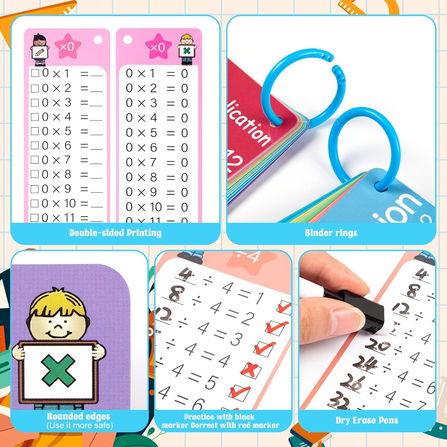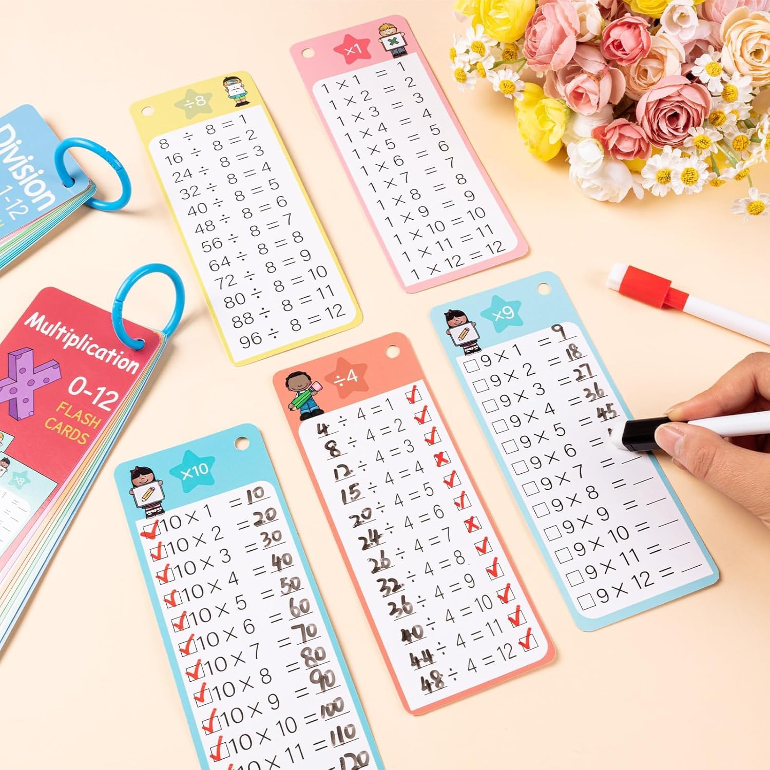 29Pcs Multiplication and Division Flash Cards, 0-12 Math Flash Card with 4 Dry Erase Pens 2 Rings, Time Table Flashes Cards for 1st to 3rd Grades Fun Learning with Math Game Educational
