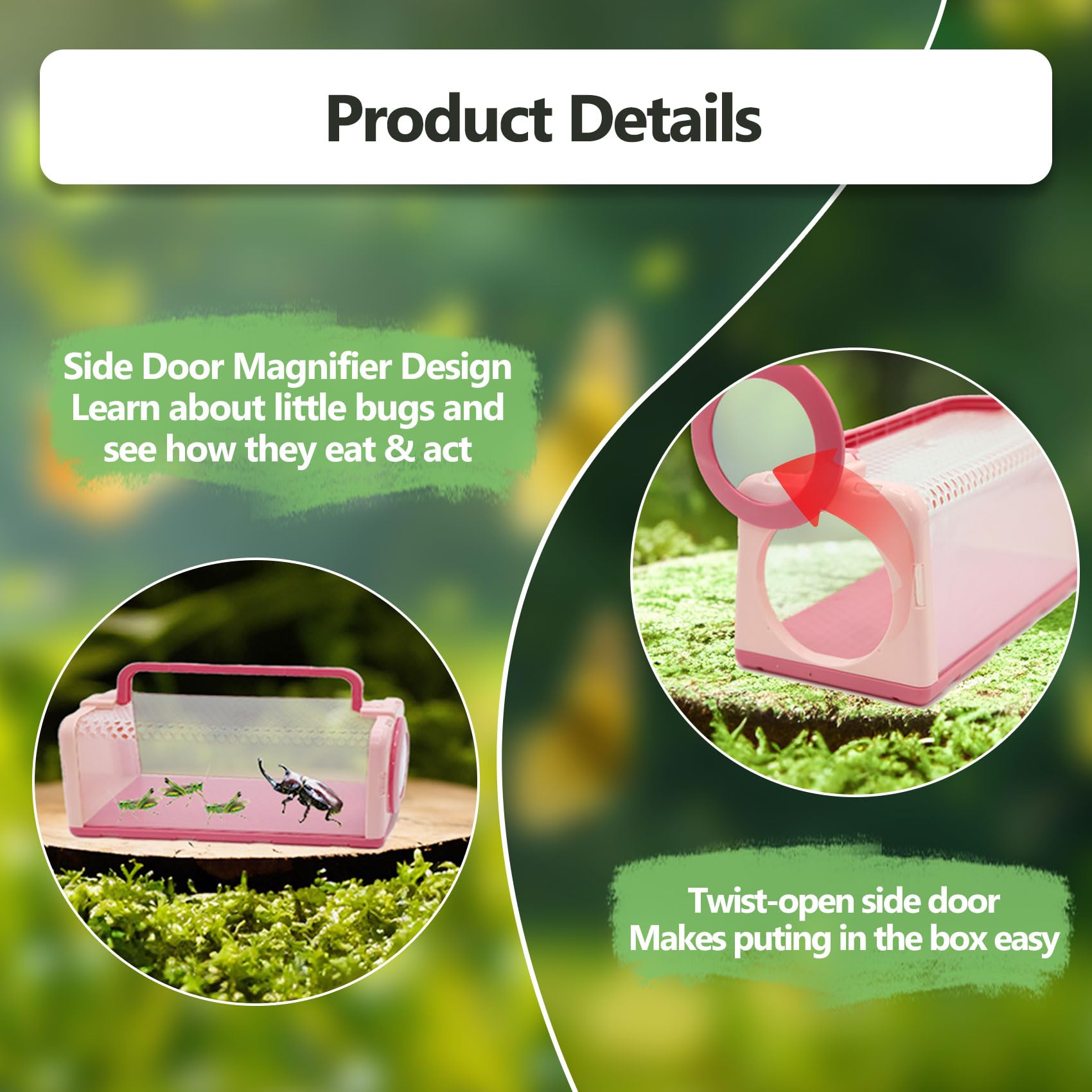- [Thoughtful design]: Each insect observation box has an adapted magnifying glass, which allows you to observe the daily activities of captured animals up close. There are many small holes on the top of the bug box, and it is very safe for the bugs to breathe.