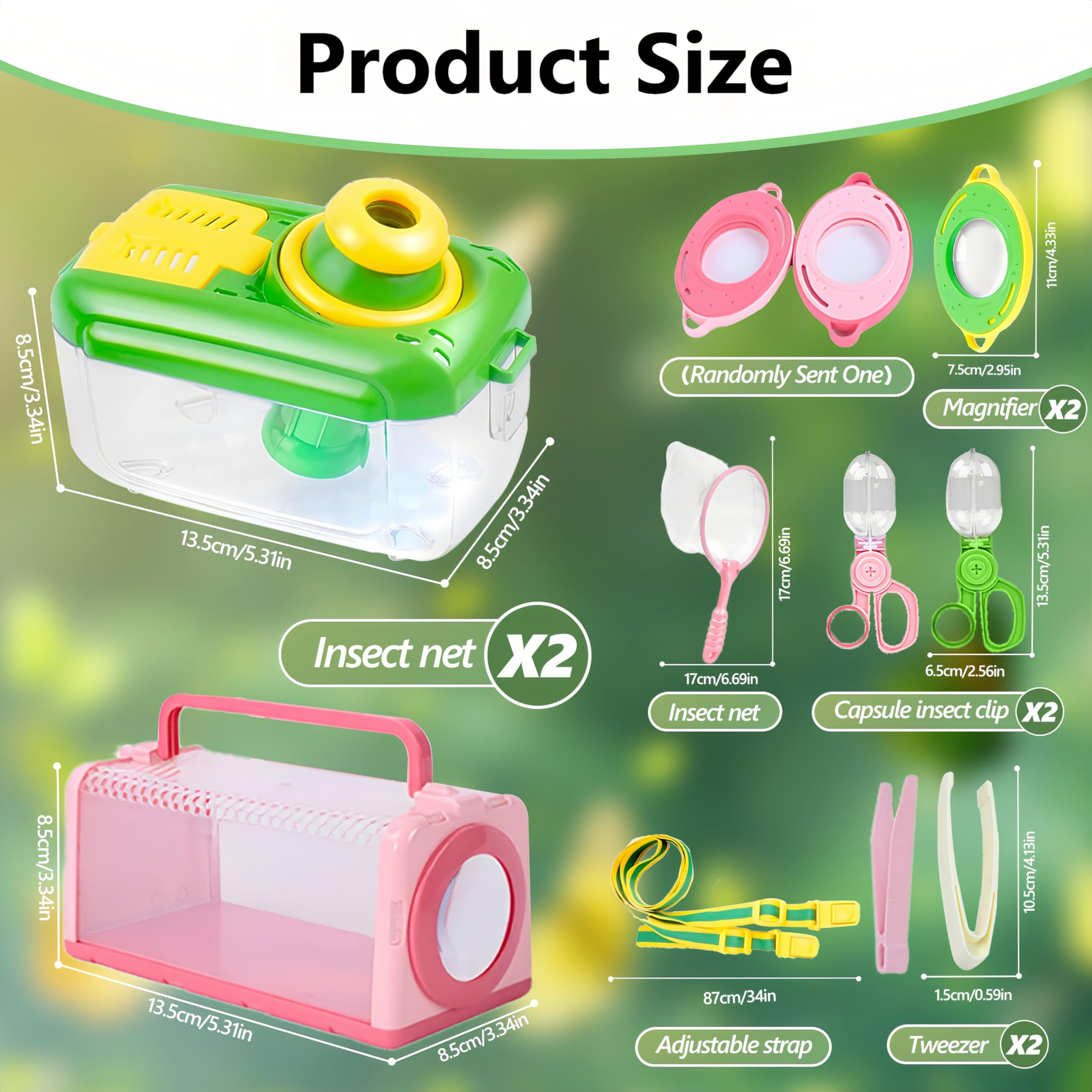 - [Suitable Size]: The sizes of the two insect catcher kits are approximately 5.31 x 3.34 x 3.34 inches and 7.48 x 3.34 x 3.15 inches. The insect collection kit allows everyone to successfully catch butterflies, grasshoppers, spiders, ants, ladybugs and other small animals in the backyard park camping exploration.