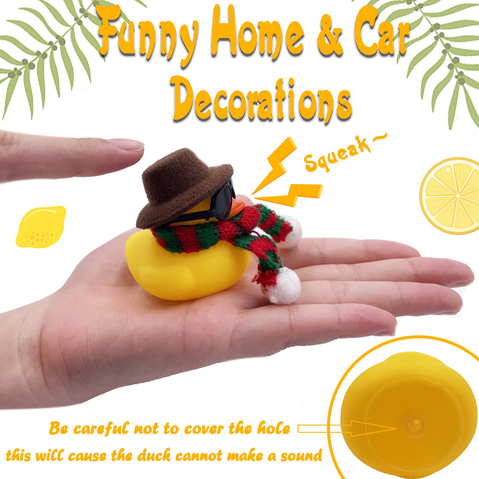 - 4.Enjoy the fun of DIY: Our duck kits come with a lot of accessories that you can DIY mix and match to create endless possibilities (When you wear a hat, please stick to tapes on both side of the duck’s head)..