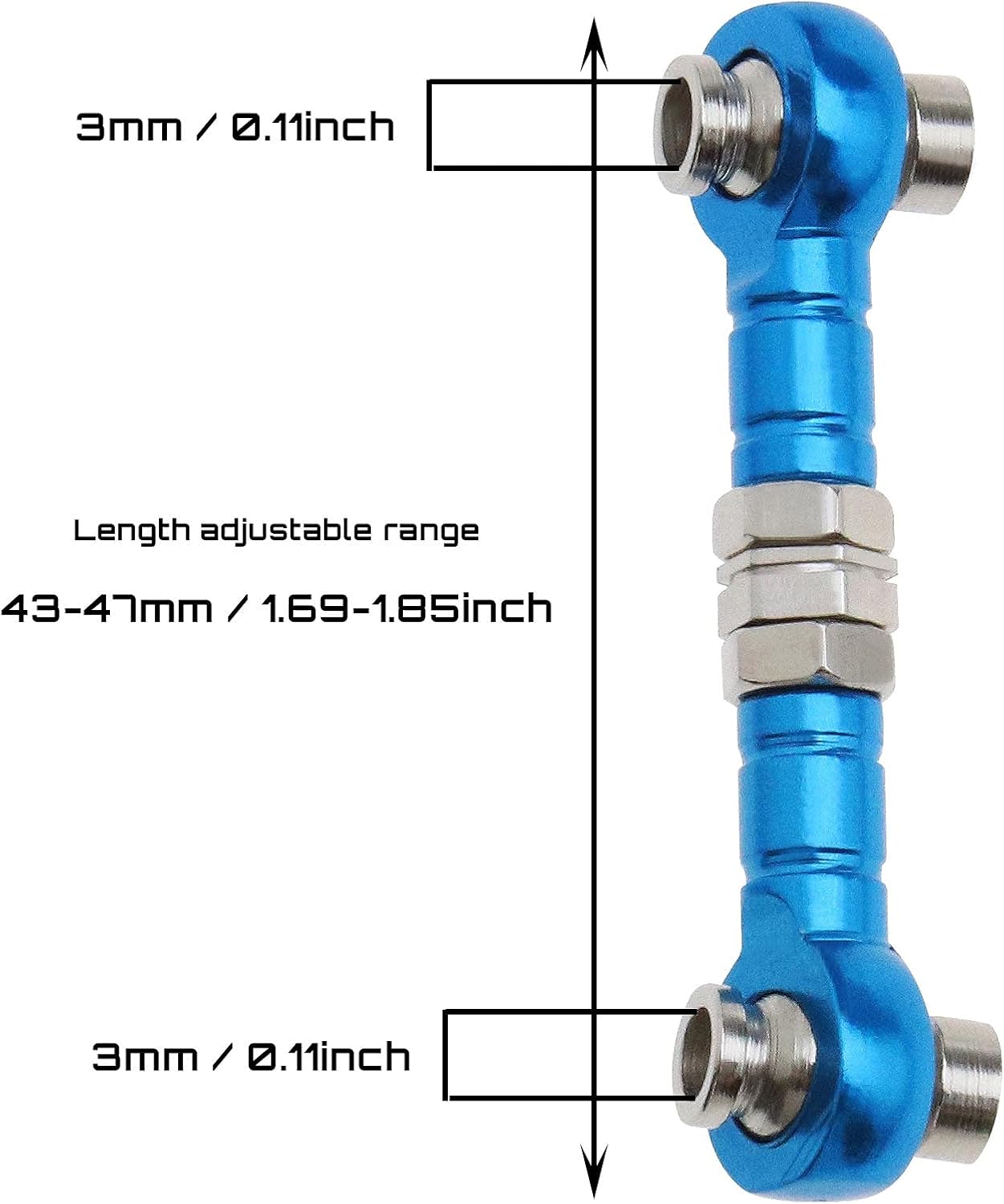 Item Descriptions:-Package Includes: 2 pcs RC steering linkage rods, each one comes with 2 screws.-Adjustable Size: Overall length is 43mm-47mm/1.69inch-1.85inch.-Usage: Used for remote control cars to improve the performance of model car.-RC Car DIY Accessory: High efficiency, can reduce unnecessary kinetic energy loss.-Applicable Models: For 94101, 94102, 94103, 94122, 94123, 94111, 94188, 94762 94763 and other models.-Replacement Parts: High precision, light weight, as a practical rc accessory, easy and convenient to useage:2x RC Metal Steering Linkage Rod4x Mounting ScrewsItem Specifications:Length:43mm-47mmHole Diameter:3mmScrew Size:M3Material:Aluminum AlloyColour:Blue