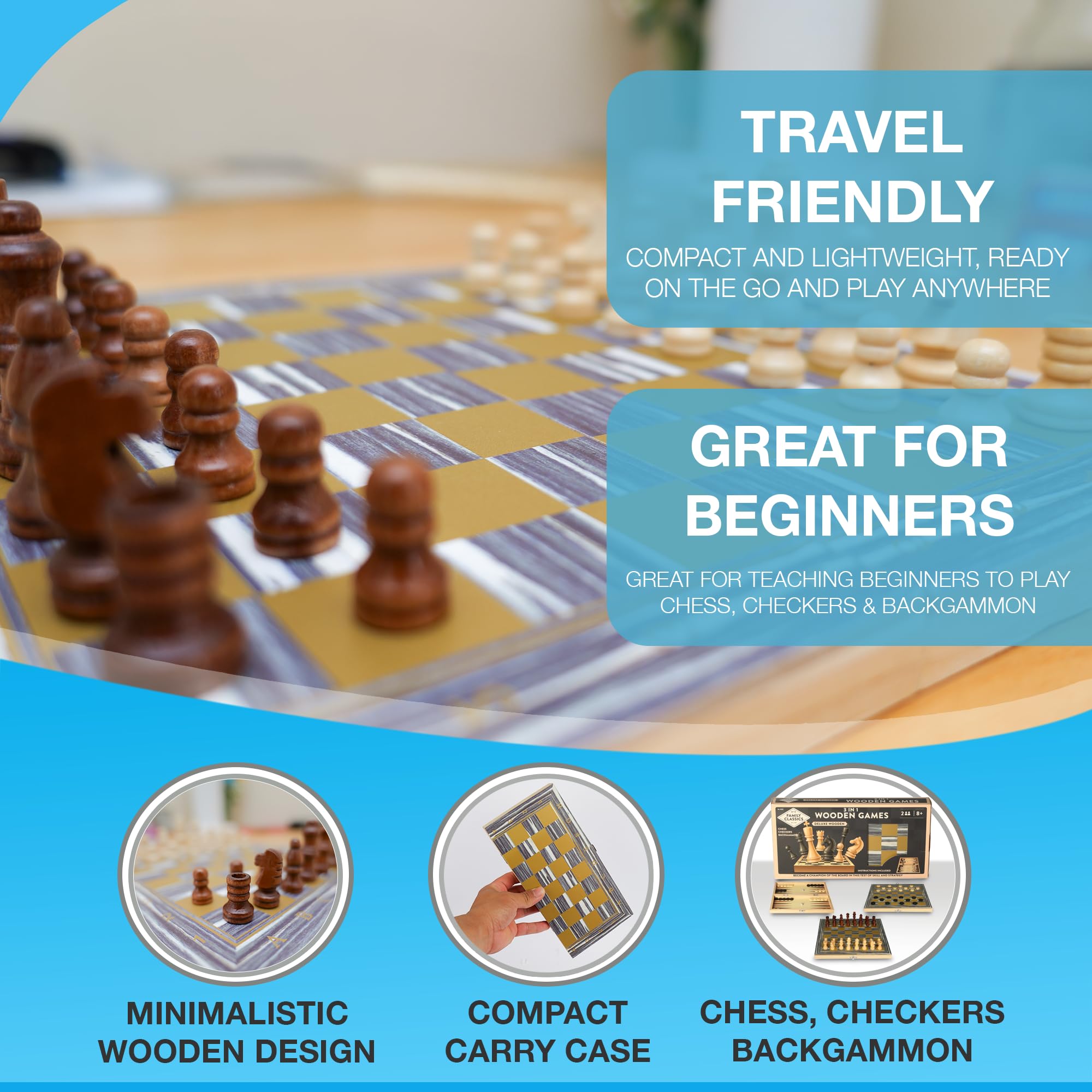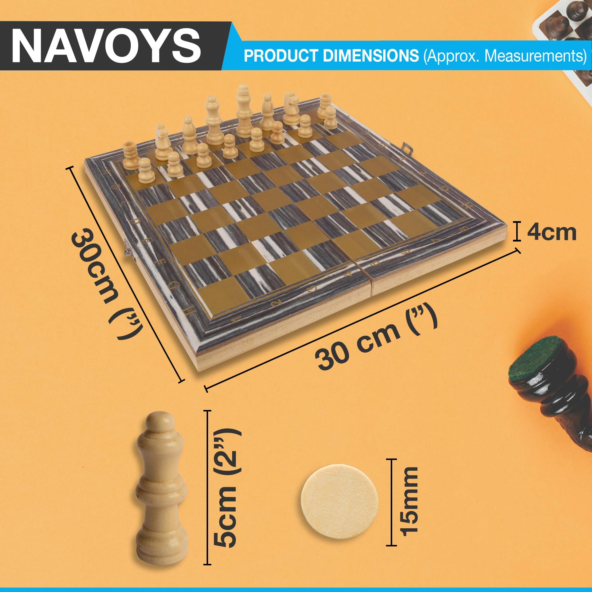 This set includes one foldable wooden box that serves as both the game board and storage case, along with a full set of chess and checker pieces. When fully opened, the board measures approximately 23 cm (9″) in length, 23.5 cm (9″) in width, and 1.5 cm (0.6″) in depth. One side features a chess/checkers board, while the reverse side is designed for playing backgammon. When folded for storage or travel, the board compacts to 23.5 cm (9.25″) in length, 11.5 cm (4.5″) in width, and 3 cm (1.2″) in depth. This space-saving design makes it easy to store or take with you on the go, while keeping all game pieces secure inside the case.