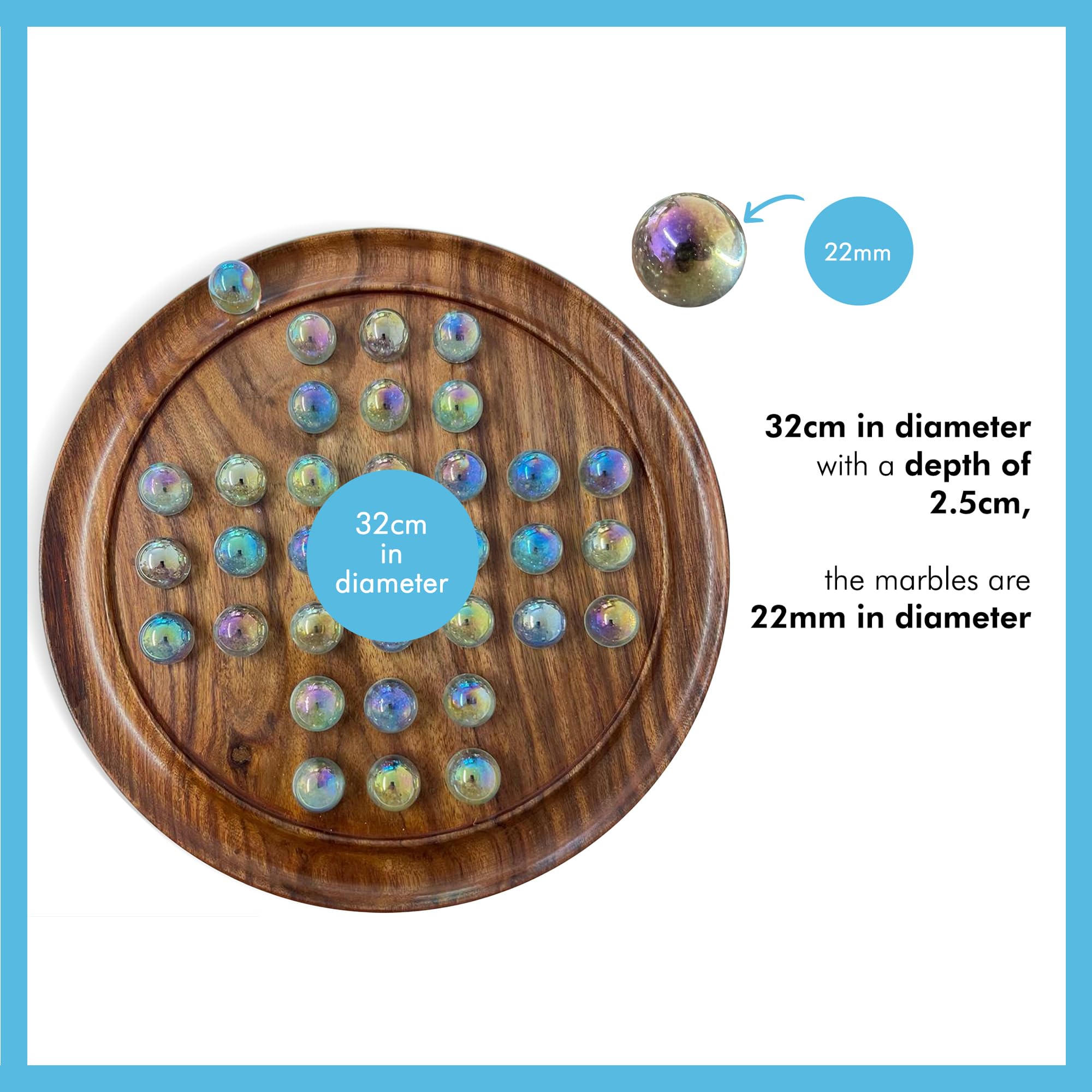 - The board measures 30CM IN DIAMETER WITH A DEPTH OF 2.5CM | 12 inches diameter with a depth of 1 inch, the marbles are 22mm in diameter | 0.85 inches in diameter, Great for individual play and an ideal way to develop the strategic mind from an early age.