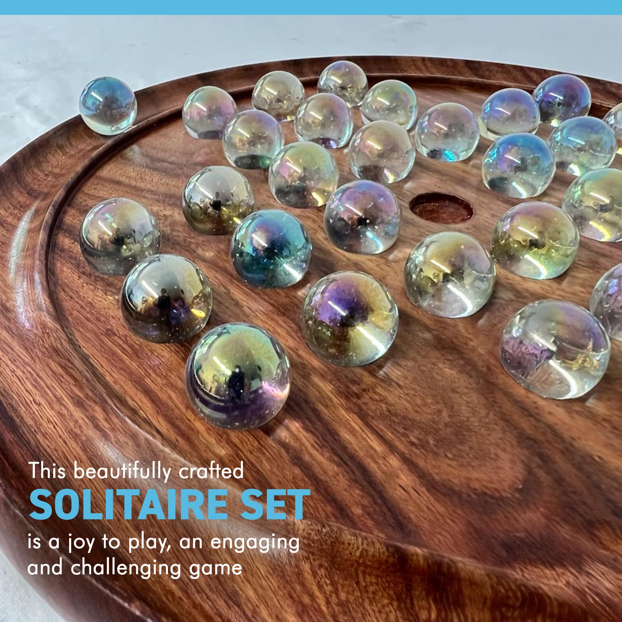 - This beautifully crafted solitaire game set comes complete with a set of 32 SOAP BUBBLE CLEAR PEARLESCENT glass marbles (plus 1 spare) which sit upon a circular board of dark wood to create a stunning contrast between the pieces, the grooved perimeter allows the spare marbles to stay close at hand.