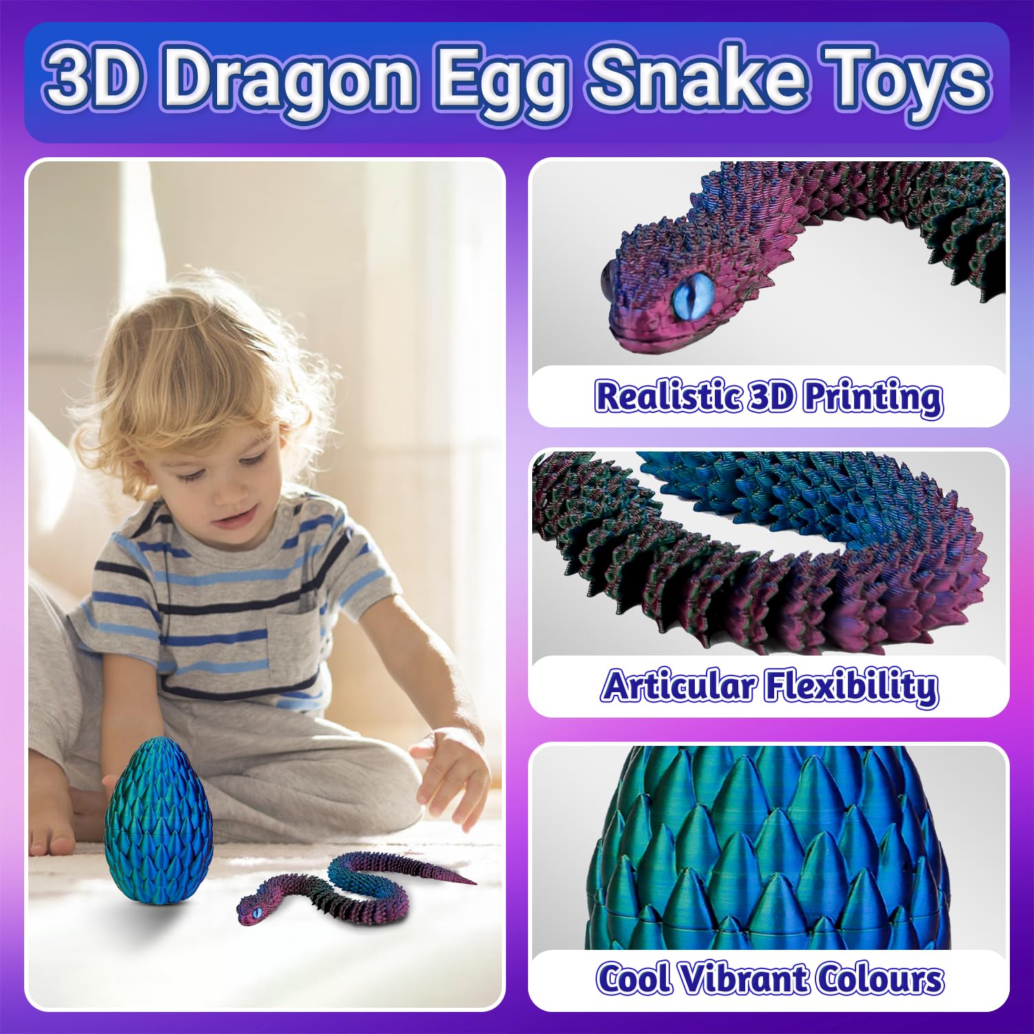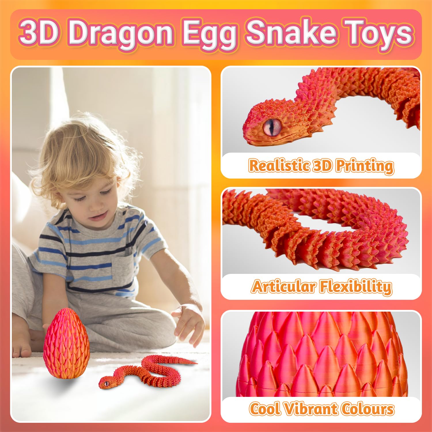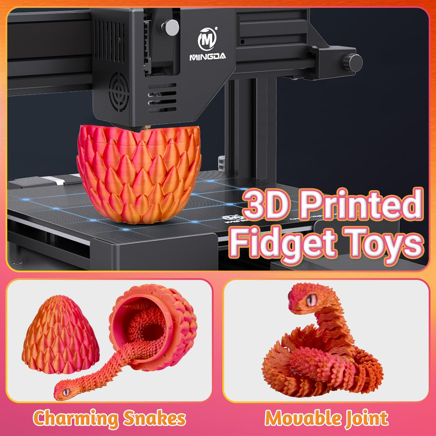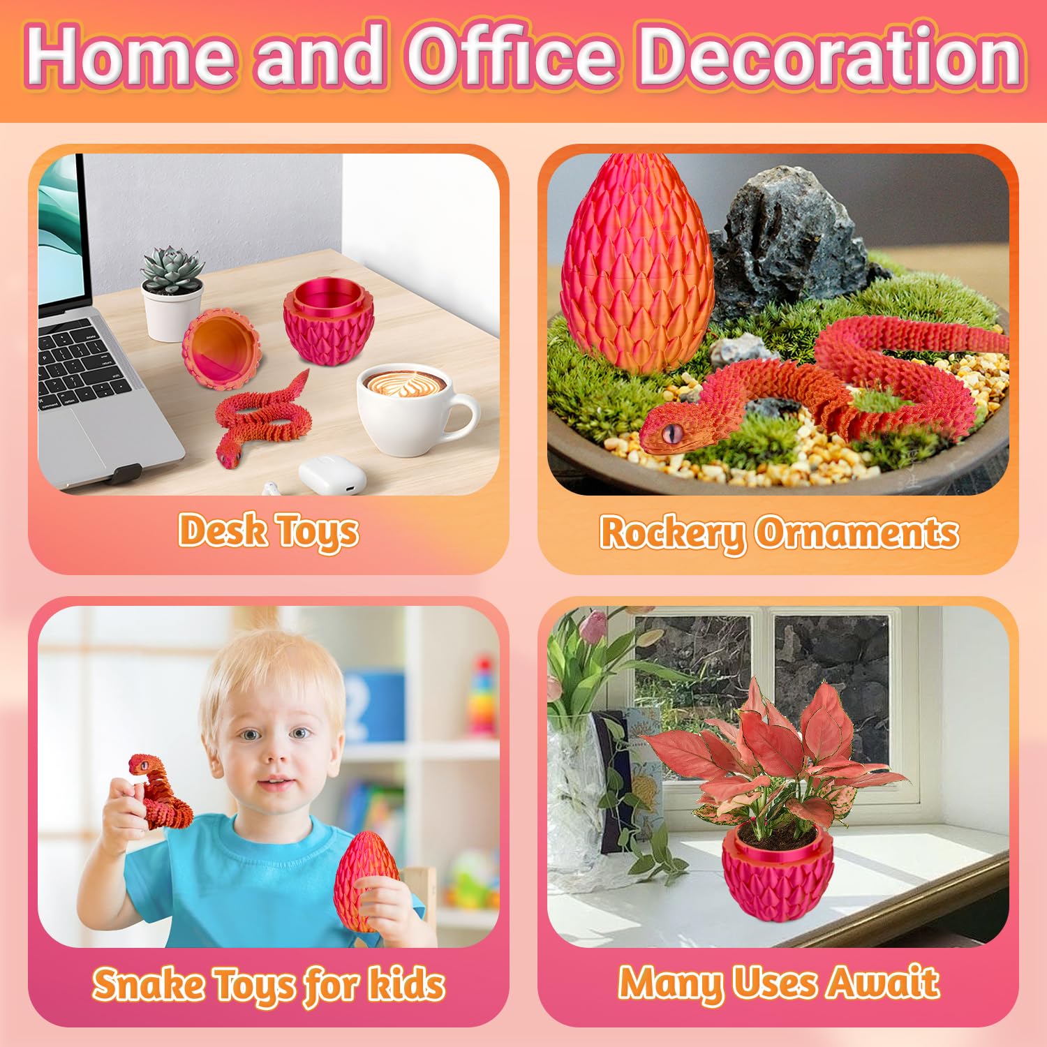 • Enhance imaginationThe unique design of this 3d printed snake in egg can enhance the imagination of children, which is a good choice for releasing children’s hands-on ability and creativity. This fidget snake is the perfect way to unwindtwist it, bend it, and watch your stress melt away!