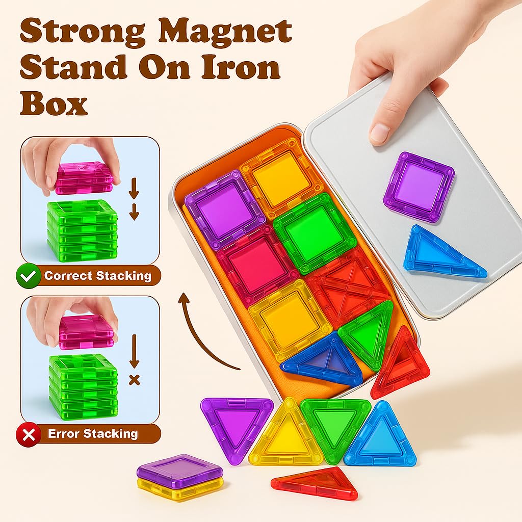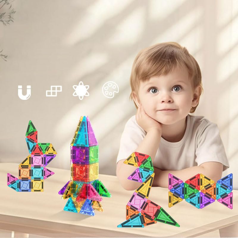 - Inspires Imagination & STEM Skills Kids can build endless shapes, towers, and patterns with the included magnetic squares and triangles. A mini build guide sparks creativity and builds early problem-solving skills.