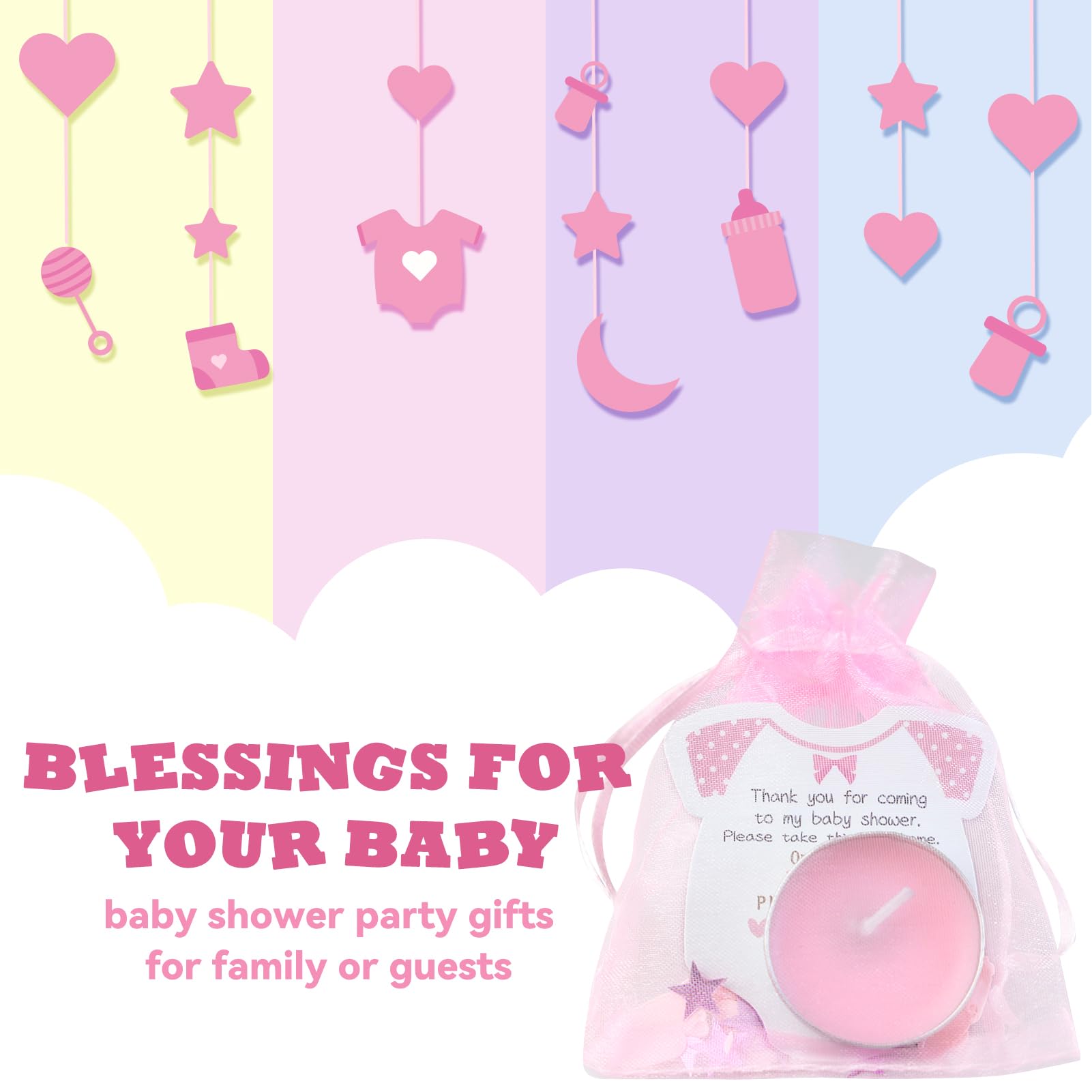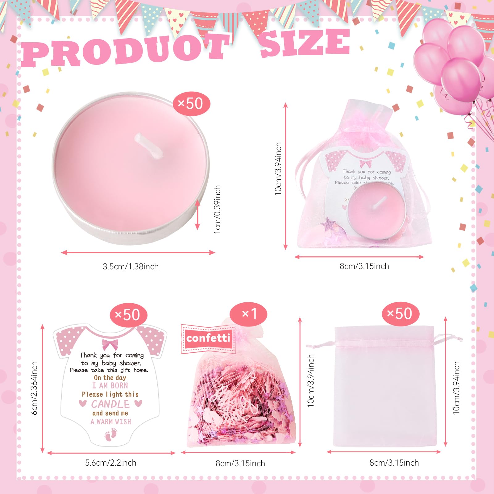 - Nice and Sufficient Combination:Baby shower favors package contains 50pcs pink tealight candles (25 pieces on one floor, totaling 2 floors),50pcs organza bags,50pcs thank you cards,in addition come with a bag confettis,nice combination and sufficient quantity enough to meet your various needs, and create a lovely atmosphere for you