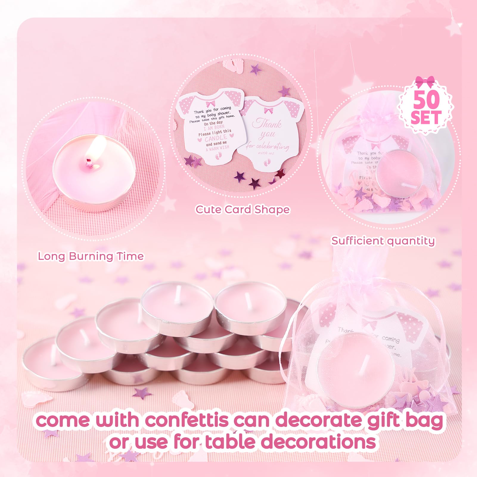 50 Sets Pink Baby Shower Favors Tea Light Candles for Guest Baby Girl Shower Party Favors Gifts with Thank Cards and Return Gift Bags Confetti for Guests Gender Reveal Party Favors