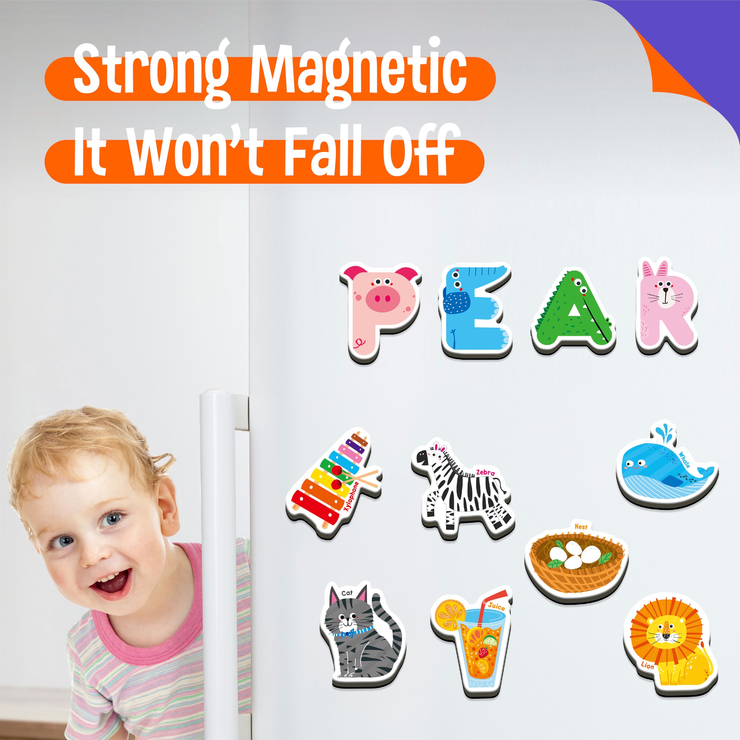 - GOOD LEARNING TOOL: It comes with 26 uppercase letter and 26 corresponding object magnets. Letters is the basic for children to learn knowledge and the cartoon characters can effectively help children remember them. Kids can play game like matching the letters and objects, which will help them recognize the letters more easily. In addition to learning letters, the cognition of different animals will be cultivated.