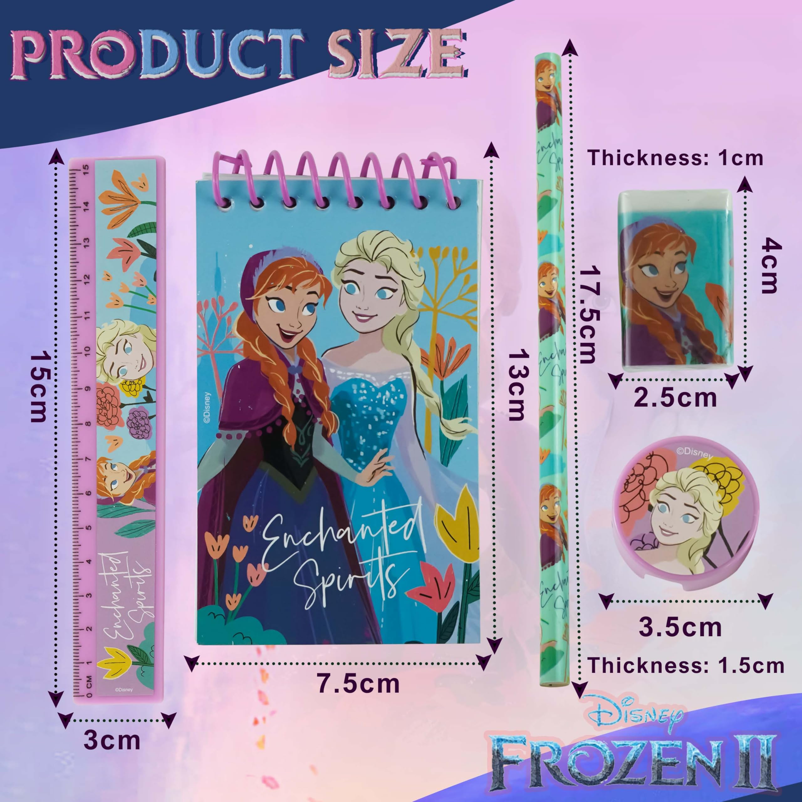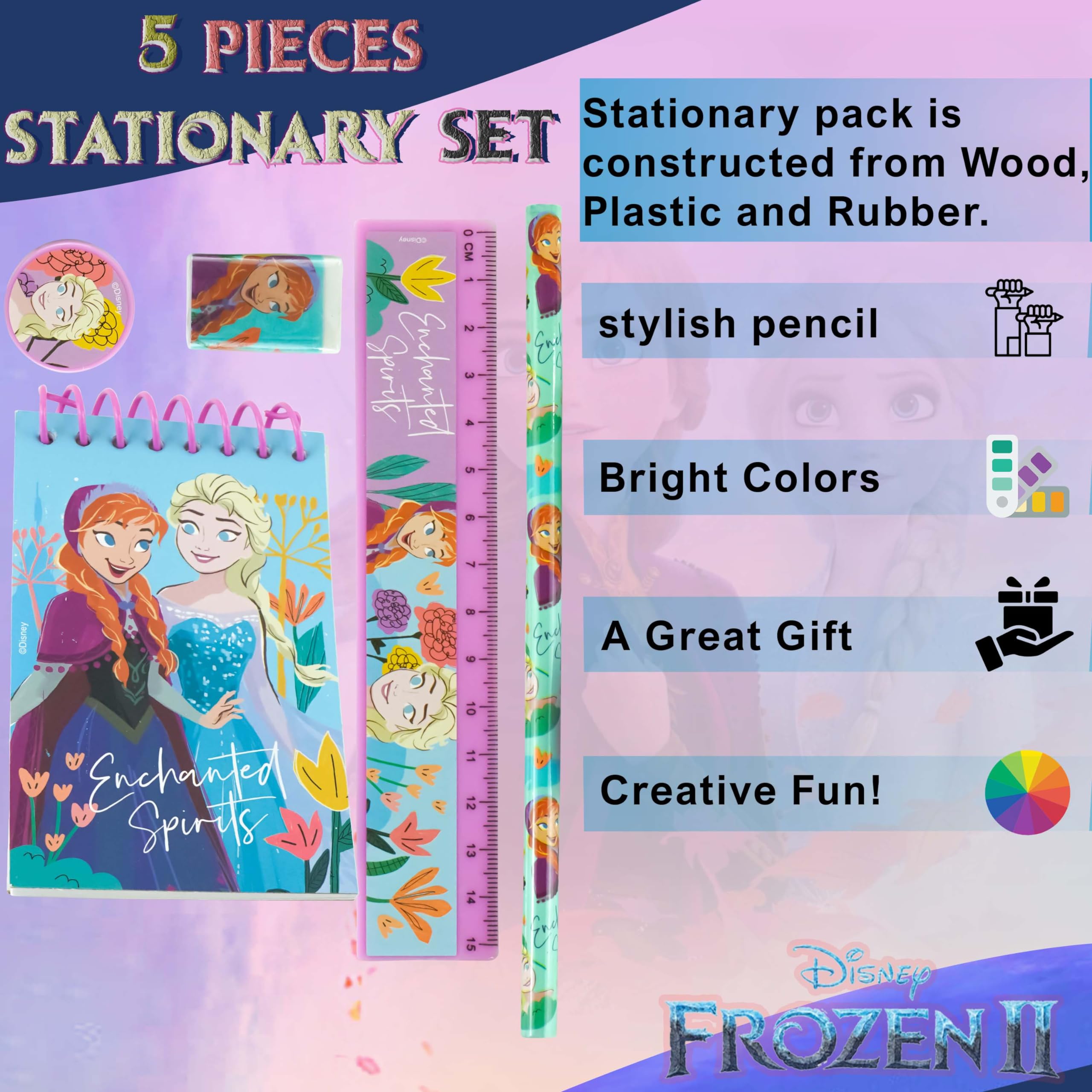 - PACKAGE INCLUDES 5Pcs Disney Frozen Stationery Set for Girls. (1x Mini Notepad, 1x Eraser, 1x Pencil, 1x Ruler, 1x Pencil Sharpener). The writing set provides all your essential stationery supplies in one pack.