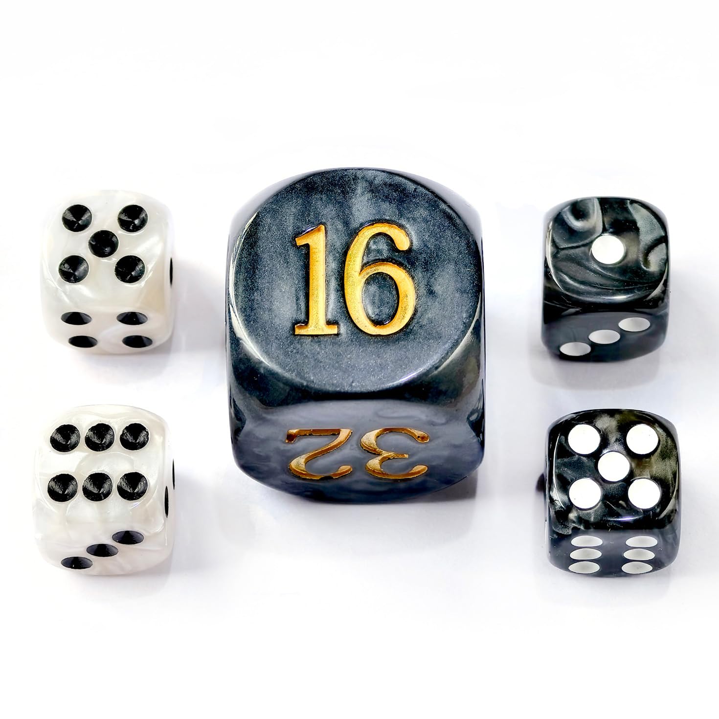 5pcs Set 30MM Backgammon Pearl Dice set – 30MM (1 3/16″) Large Backgammon Doubling Cube Plus 4pcs 16MM Dice (Black/White Marbleized)