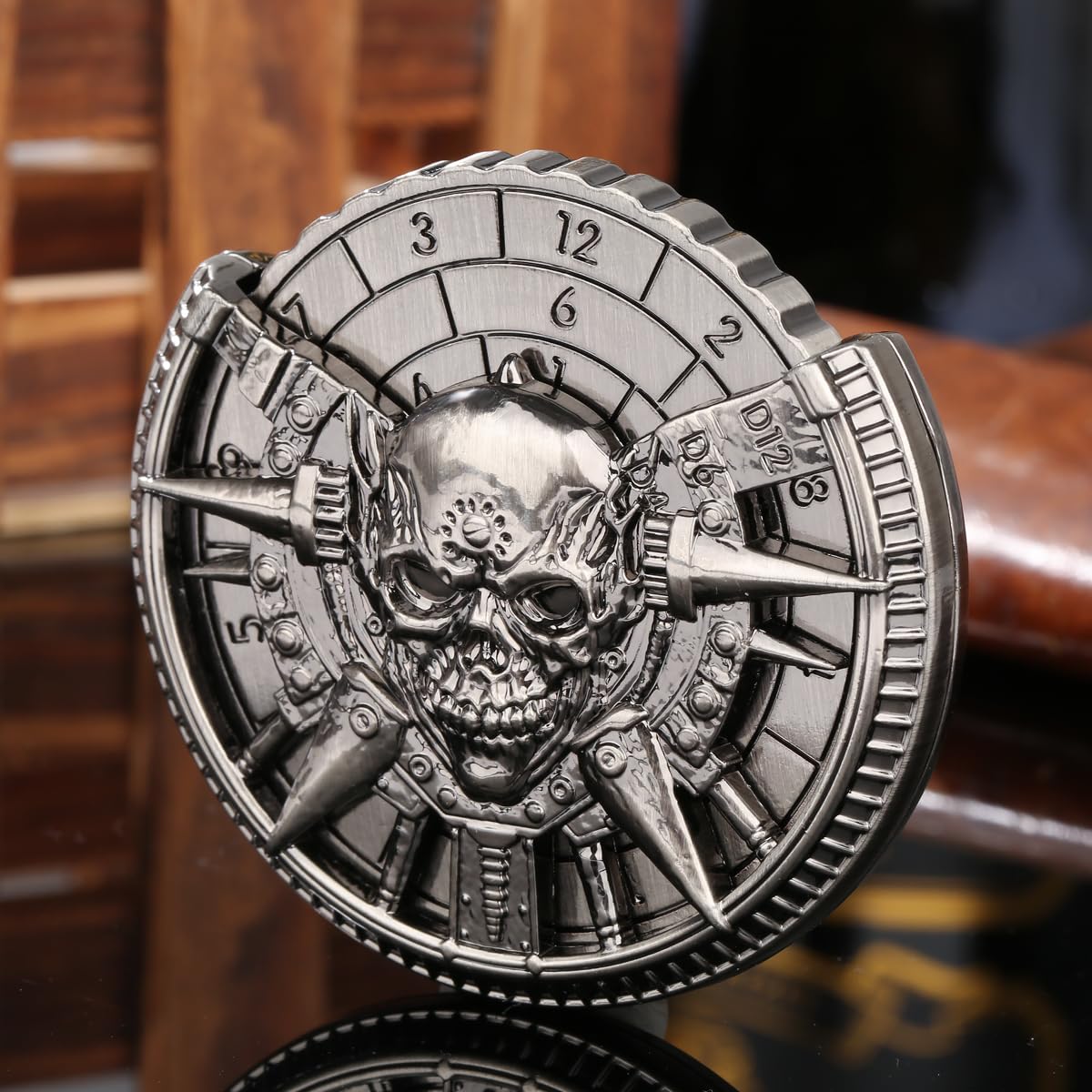 Unique Corpse Skull Design:This 7-in-1 metal dnd dice set roulette dice spinner stands out with its innovative combination of a compass and rolling dice, offering an unparalleled stimulating experience.The are engraved with numbers representing different dice sets, including D20, D10, D8, D12, D6, and D4.