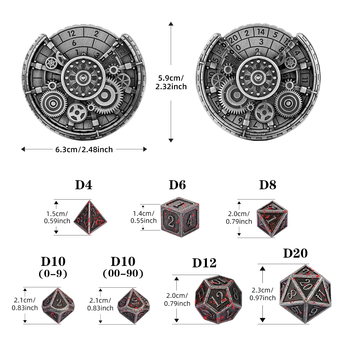 - Versatile accessories: the spinner has artfully designed hollow gear patterns; various three points on each sideand including D20, D10, D8, D12, D6 and D4. Including 1xD20, 1xD12, 2xD10 (one 00-90, one 0-9), 1xD8, 1xD6, 1xD4