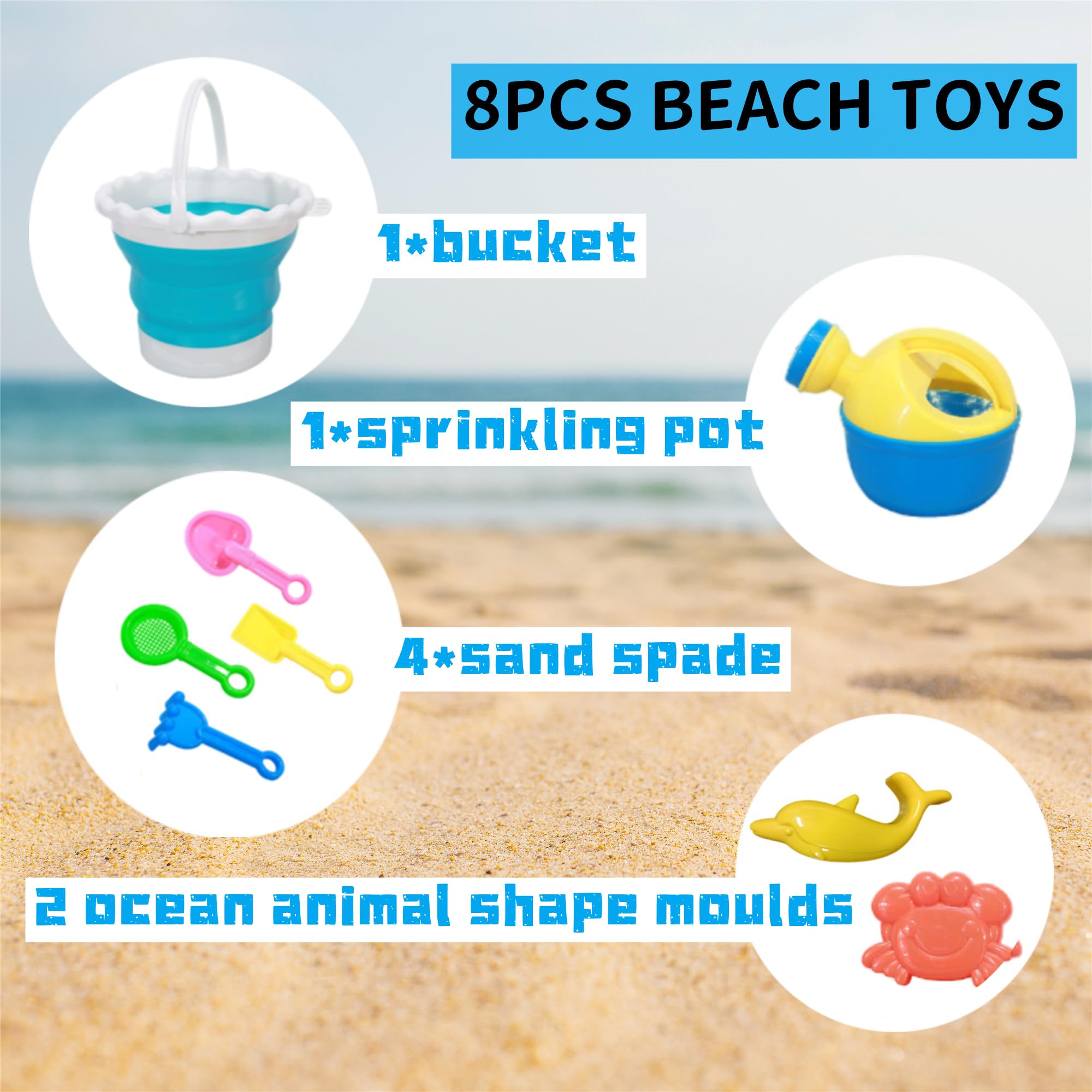 - 8 PCS Sand ToysThis beach toys set includes 1 bucket, 1 sprinkling pot, 4 sand spades, and 2 molds with ocean animal patterns, enabling children to play freely on the beach and create endless imaginative fun.