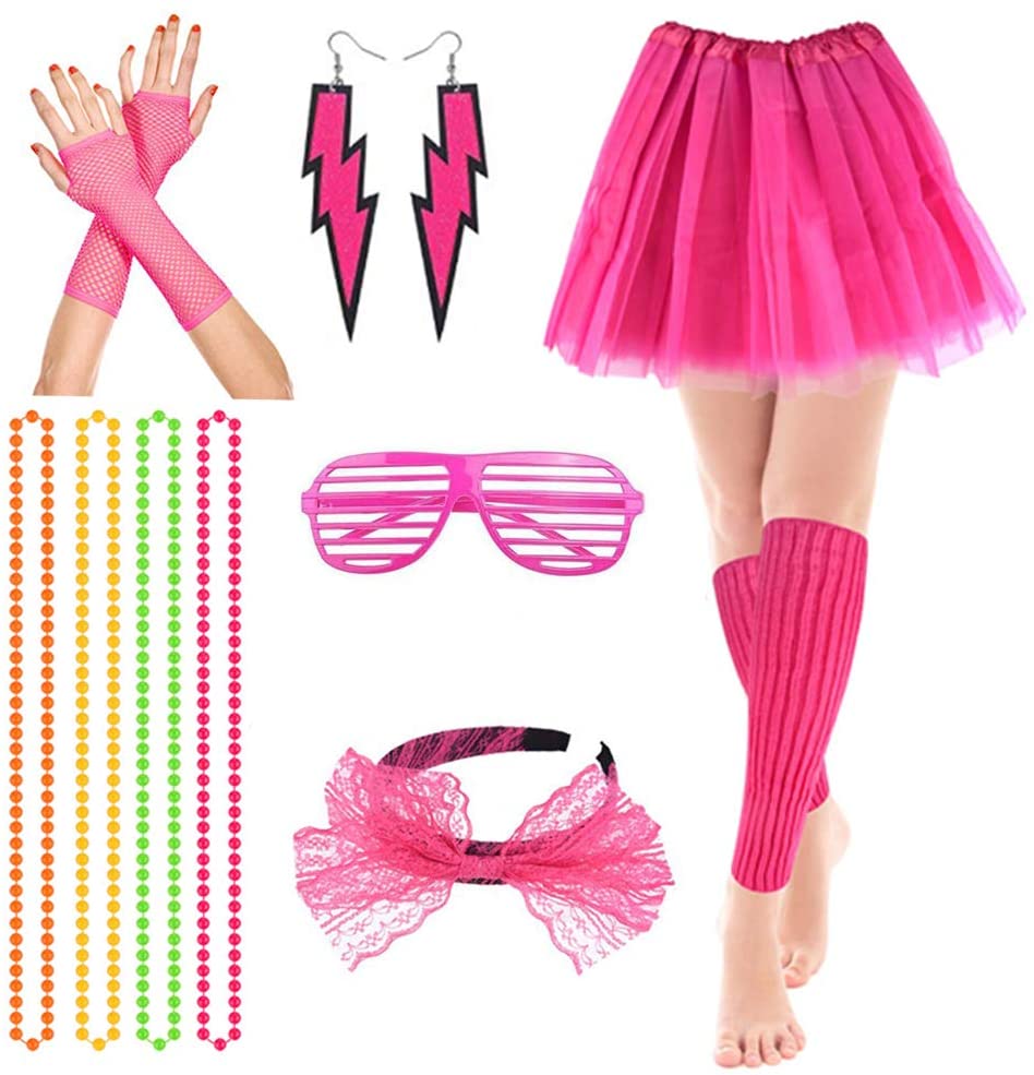 80s Fancy Party Costume Accessories Set,Adult Tutu Leg Warmers Fishnet Pink Gloves Neon Necklaces Bead 80s Lace Bow Headband Lighting Earrings Sunglasses,1980s Fancy Dress Girls Women Night Out Party