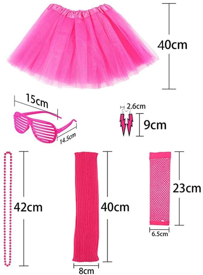 - ✿GOOD MATERIAL : The gloves are made of nylon with good elasticity, earrings, shutters glasses and necklace beads are made of plastic, The leg warmers are made of 100% Nylon, the tutu skirt is made of lace, suitable for girls and women are washable and can be applied repeatedly with good quality all this 80’s accessories fit well for most of women and girls.