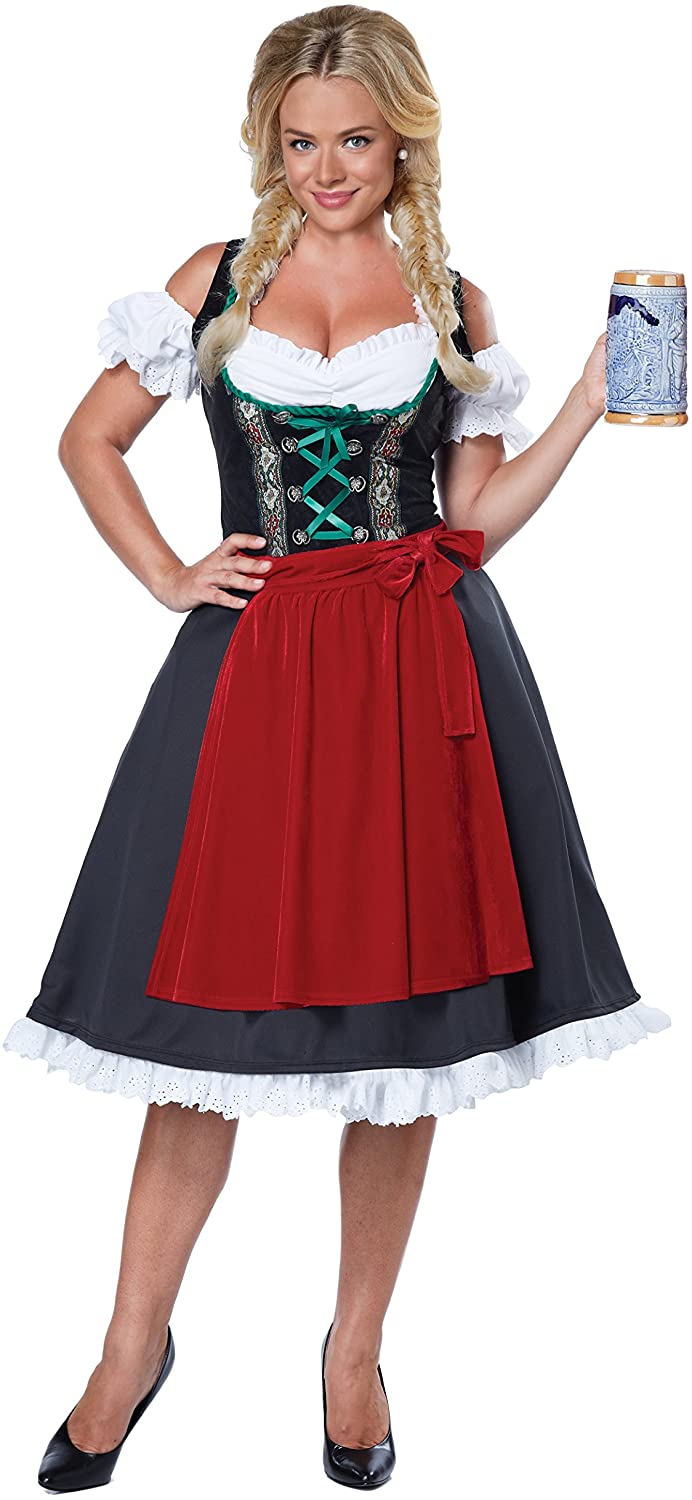 Prost! This Oktoberfest Fraulein Adult Costume is based on traditional German dirndl dresses.100% polyester costume comes with dress with attached corset, apron and pettiskirt. Beer stein/mug, jewelry, and shoes not included. Adult sizes.