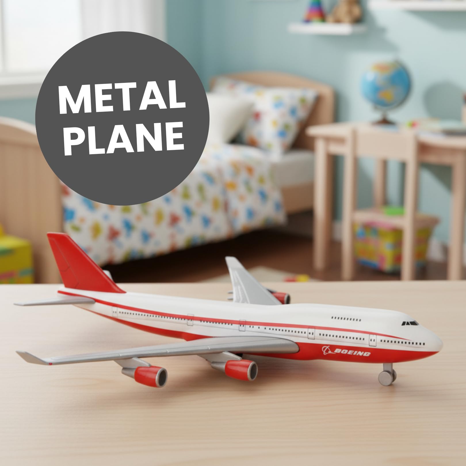 - DESIGN DETAILS: Die-cast metal aircraft model featuring a white fuselage with red accents and four detailed engine turbines