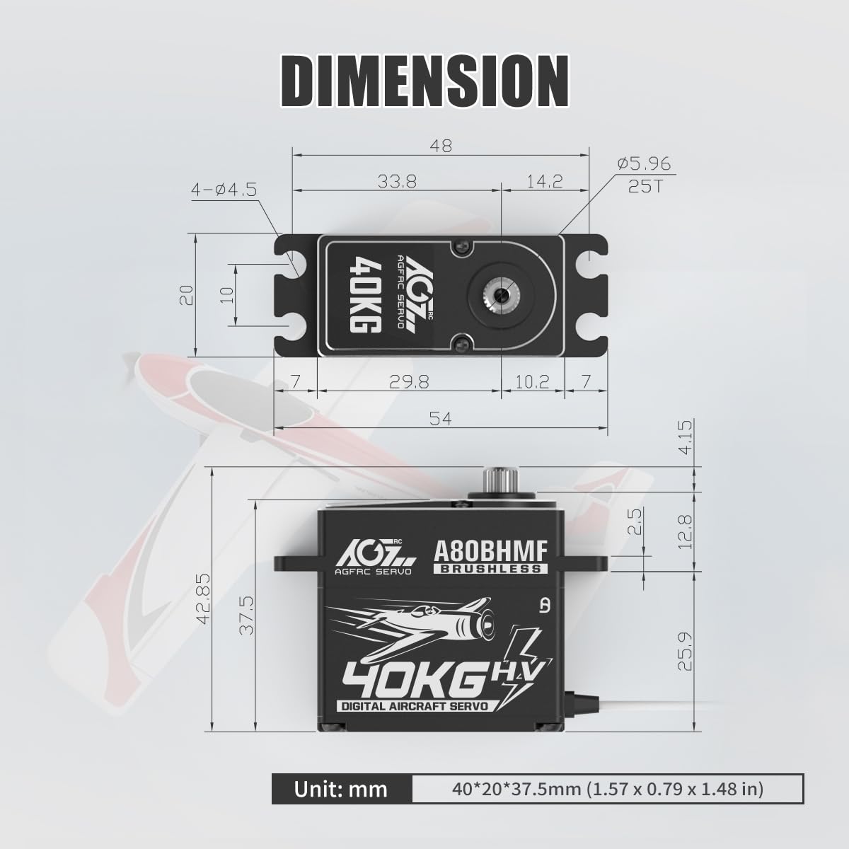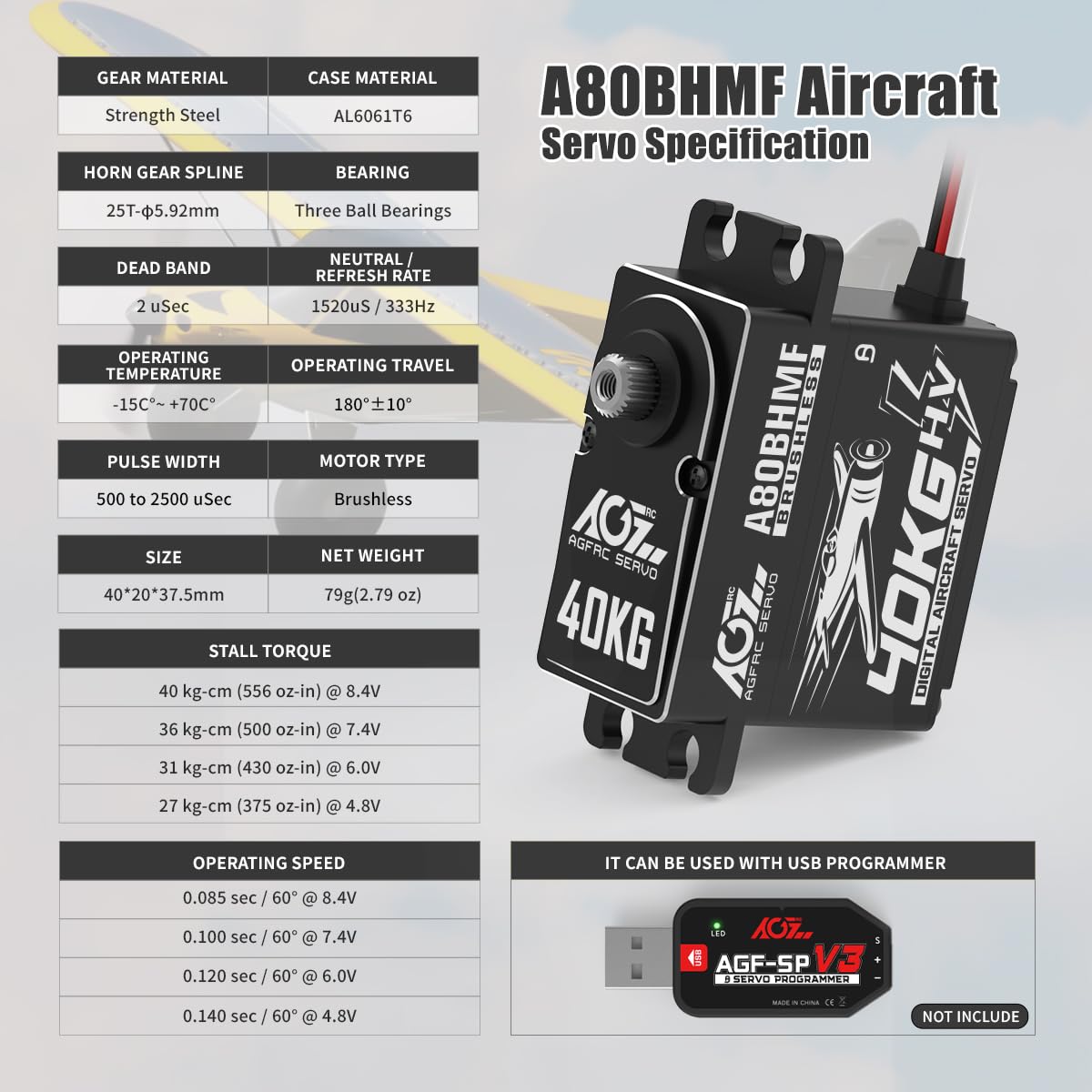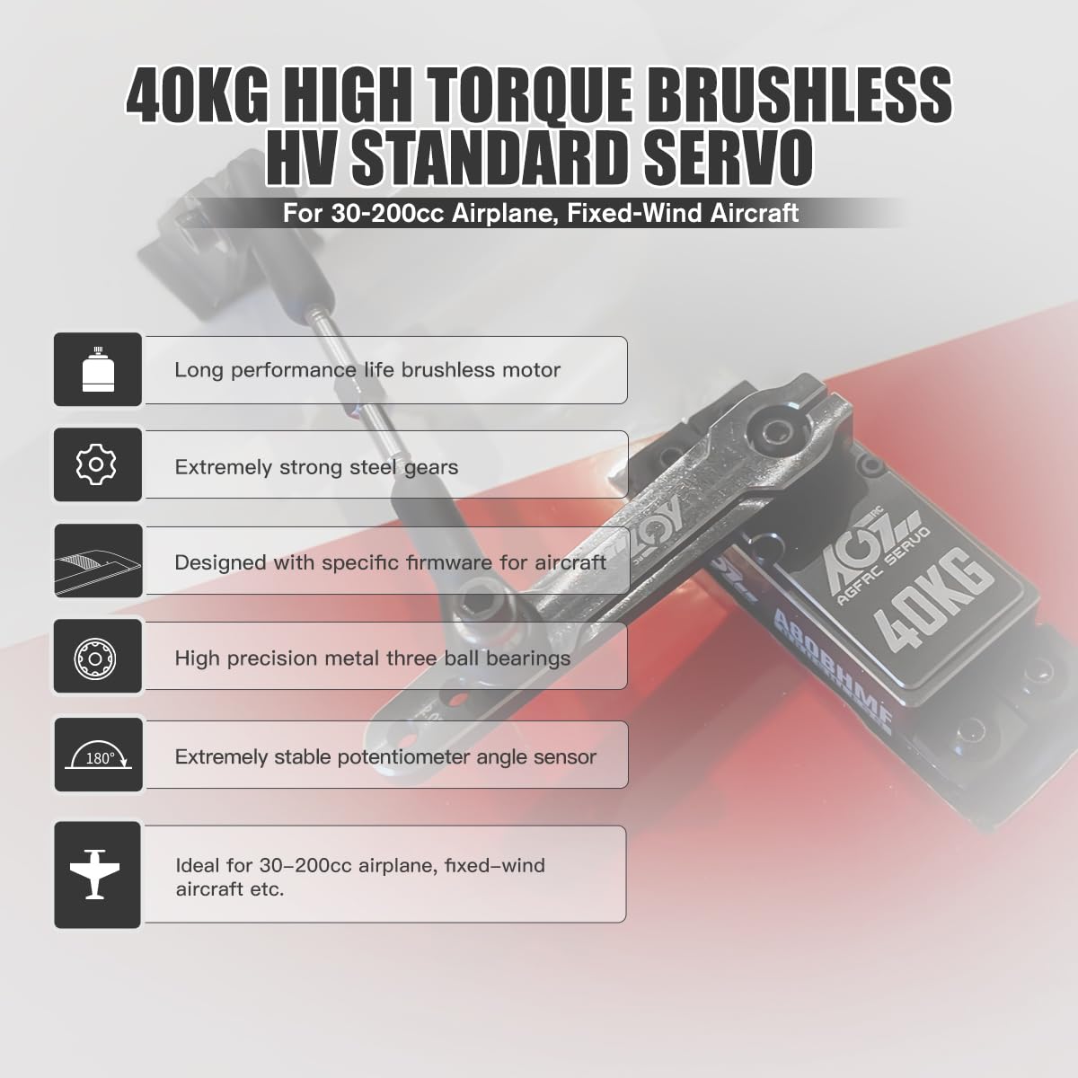 AGFRC 40KG High Toruqe RC Servo – Steel Gear Programmable Digital Brushless Standard Servo for 30-200CC RC Airplane(A80BHMF Aircraft)