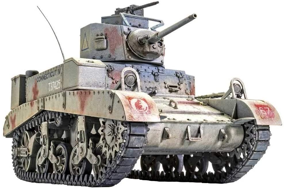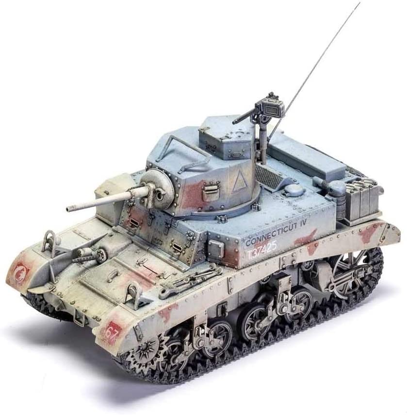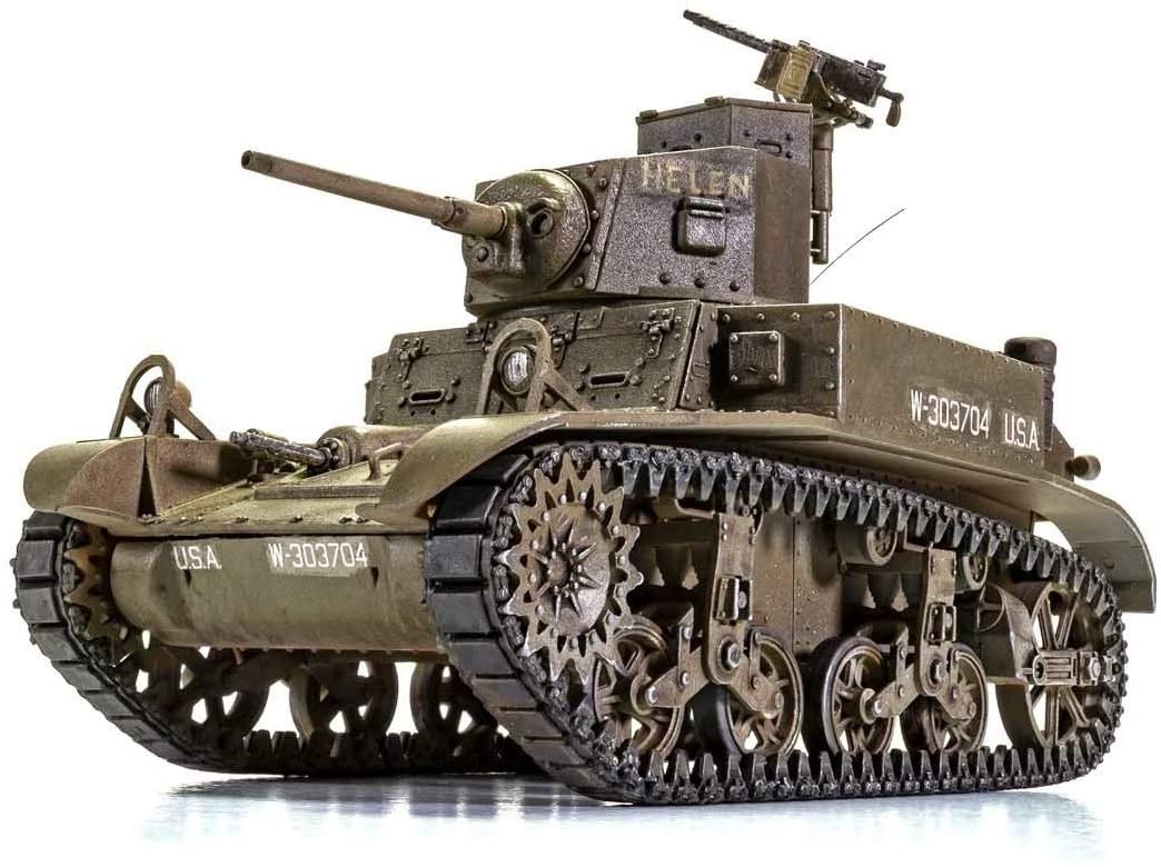 The British named the M3 “General Stuart” upon receipt of the tank under the Lend-Lease program in June of 1941. The tank’s ability to “shoot and scoot” as well as keeping the crew safe from small fire arms fire, earned an affectionae nickname of “Honey” by its operators. The British cavalry men liked this tank as it could travel 10 to 20 mph faster than their own or enemy tanks, and for its ease of maintenance. The M3s were designed to replace the outdated M2s. The M3 incorporated a thicker armor, lengthened hull, and a trailer idler wheel to act as another road wheel to decrease ground pressure and improve weight distribution. The M3 turret had three pistol ports and shortened recoil mechanism. It was also equipped waith a 37mm M6 gun, which was adequate early in the war, but by 1942, the German counterparts far surpassed the range of the M3. The narrow width of the M3 could not accommodate a larger gun. The M3A1 was fitted with a Westinghouse gyrostabilizer, a turret basket and an oil gear hydrolic traverse mechanism, but lacked a turret cupola. The earlier version of the M3A1, the Stuart III, was powered by Continental W-970-9A-7 cylinder radial gas 250 hp engine but by mid 1941, the Stuart IVs came off the production lines with Guiberson T-1020 air cooled radial diesel engine. Please note, box and model dimensions are shown as identical however only represent the box/package size.