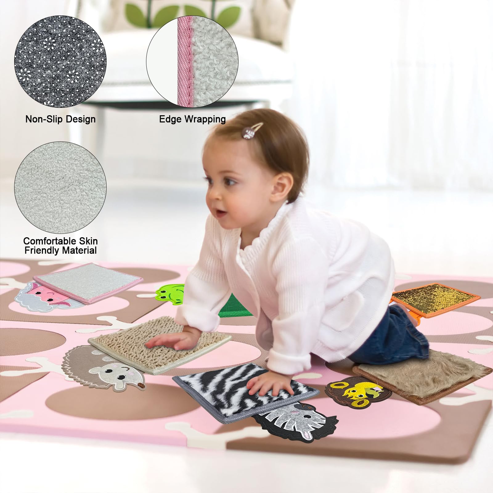 - Soft and Skin-FriendlyThe sensory mat features a non-slip design on its back and is crafted from high-quality materials, ensuring your child’s comfort whether touching it with their hands or stepping on it with their feet. Each mat is equipped with an edge-wrapping design, providing durability and resistance to wear and tear, making it suitable for gripping, pulling, and stepping. This design is particularly friendly for little ones with ADHD.