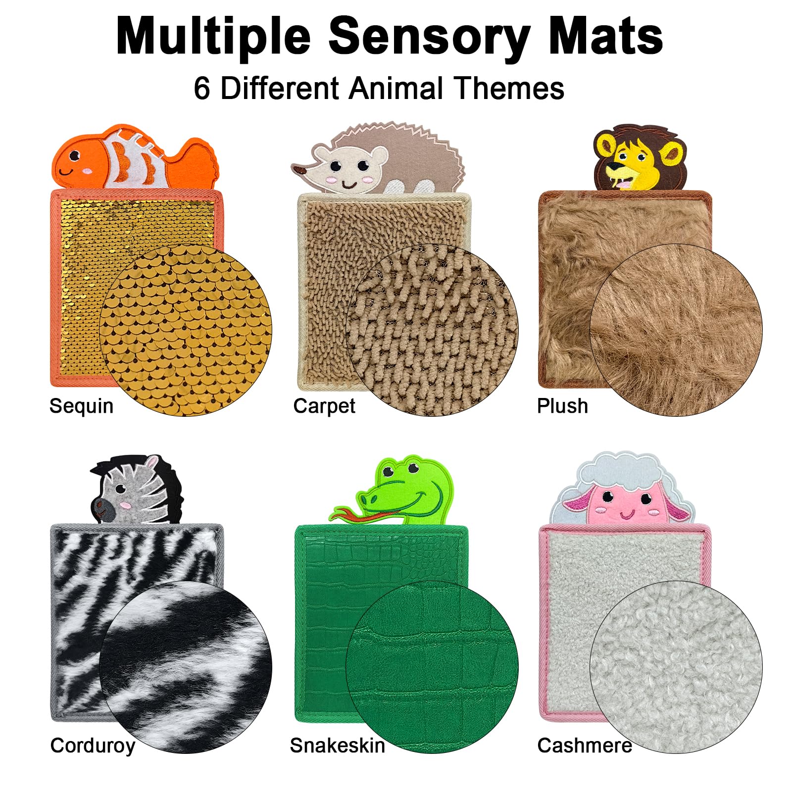 - Diverse TexturesYou will receive the animal themes sensory mats in 6 kinds of materials, including fish/snake/lion/zebra/hedgehog/sheep, offering a variety of tactile experiences. By touching these mats, children can enhance their ability to distinguish between different tactile sensations, providing them with a more enriching sensory experience.