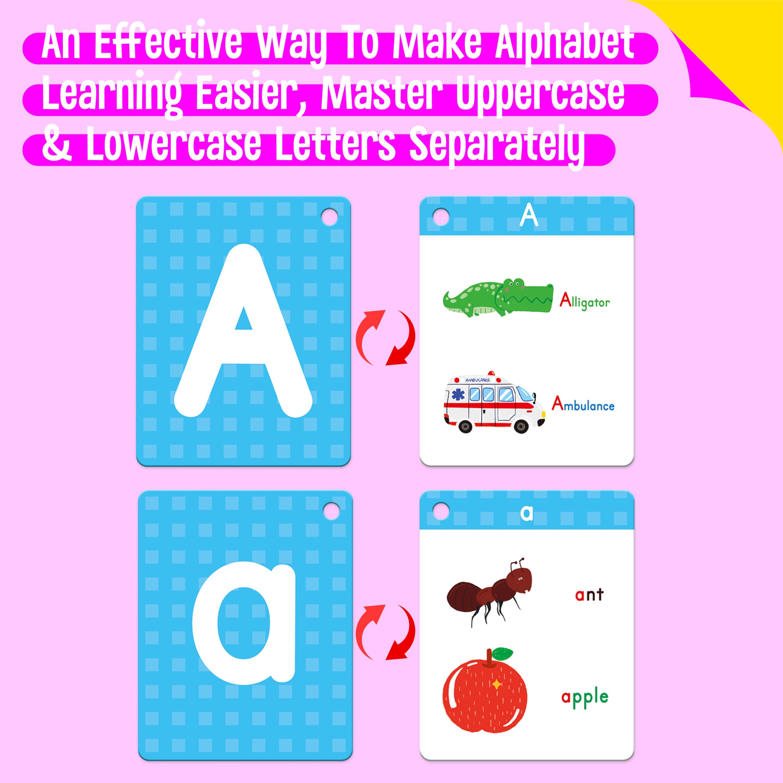 - 52 Double-sided Flashcards: This set includes 52 jumbo-sized flashcards, with separate cards for uppercase and lowercase letters. The front of each card features a bold, clear letter, while the back includes two simple and age-appropriate words starting with that letter, accompanied by adorable illustrations. These engaging visuals and simple words help children connect letters with their sounds effectively.